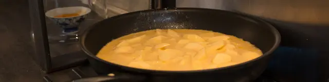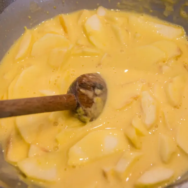 Cut the apples into thin strips. Add them to the mix. Then lightly oil the frying pan; when it is hot, pour two ladles of mixture containing the fruit into the pan.