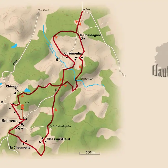The 12th century church watches you go towards the hamlets of La Chaumotte and Chassac-Haut. Through hollow paths lined with low dry stone walls, through woods or on the edge of meadows, by the footbridge over the Artaude at the Atoir bridge, you will arrive at Chassagnol and the historic "tacot" station with its crane car. After Chaumerliac and its old mill, you can see wild boar stumps, an original flora, a Serbian, a beautiful pond and, just before the return to the starting point, the fountain of the Bourg. Yellow markings.