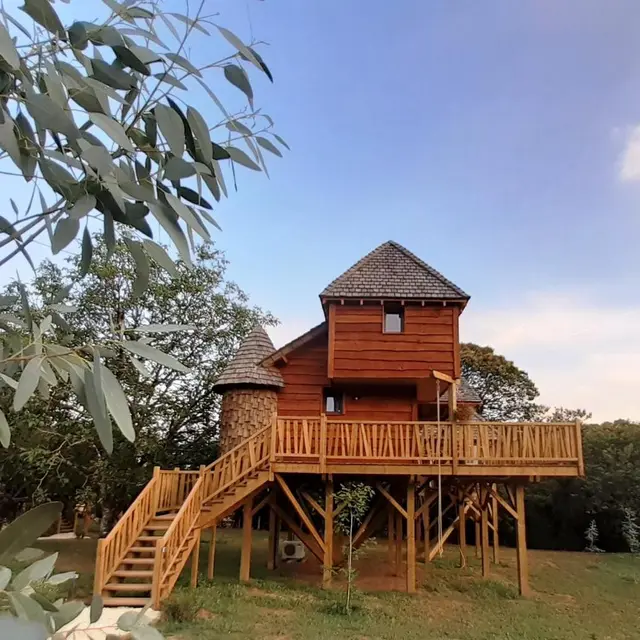 Hut perched in a wooded environment, fully isolated for the winter and air-conditioned for the summer.
