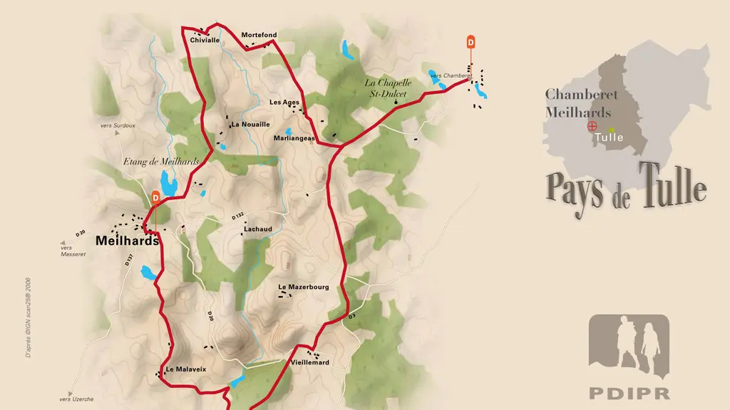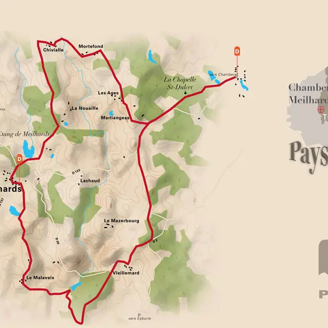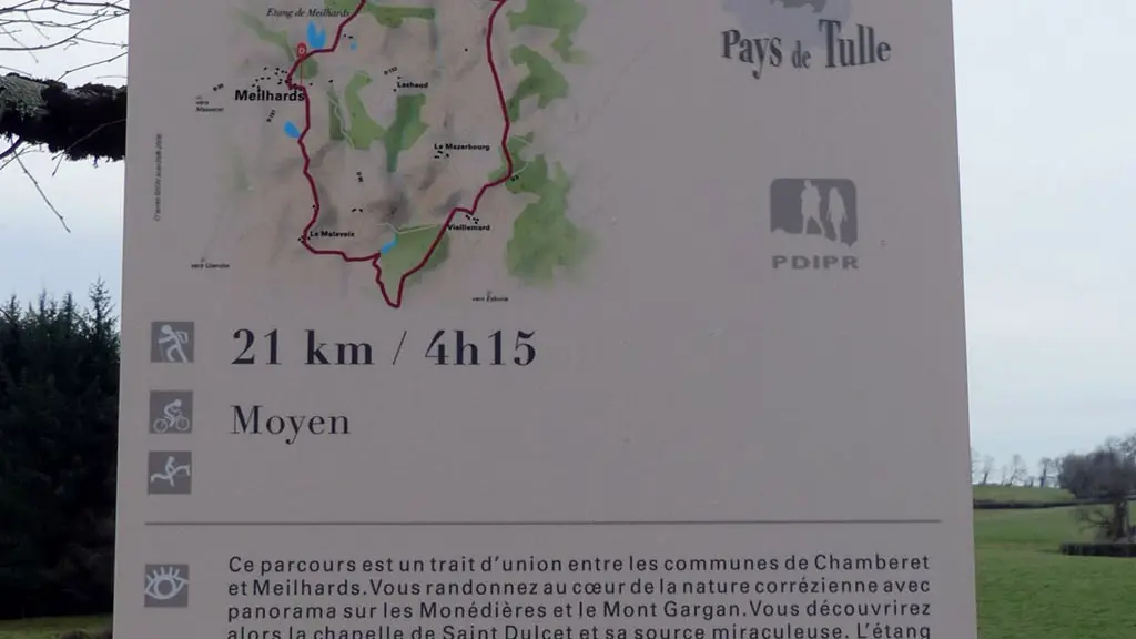 This route is a link between the communes of Chamberet and Meilhards.you will hike in the heart of the Correze nature with panorama on the Monédières and the Mont Gargan.you will discover then the chapel of Saint Dulcet and its miraculous source. The pond of Meilhards constitutes a very pleasant bucolic stop. The preserved nature offers you all its fauna and environmental wealth. Yellow markings.