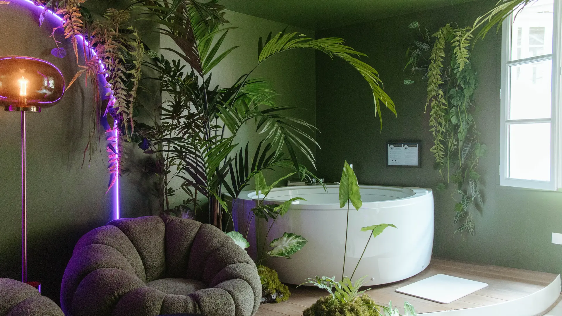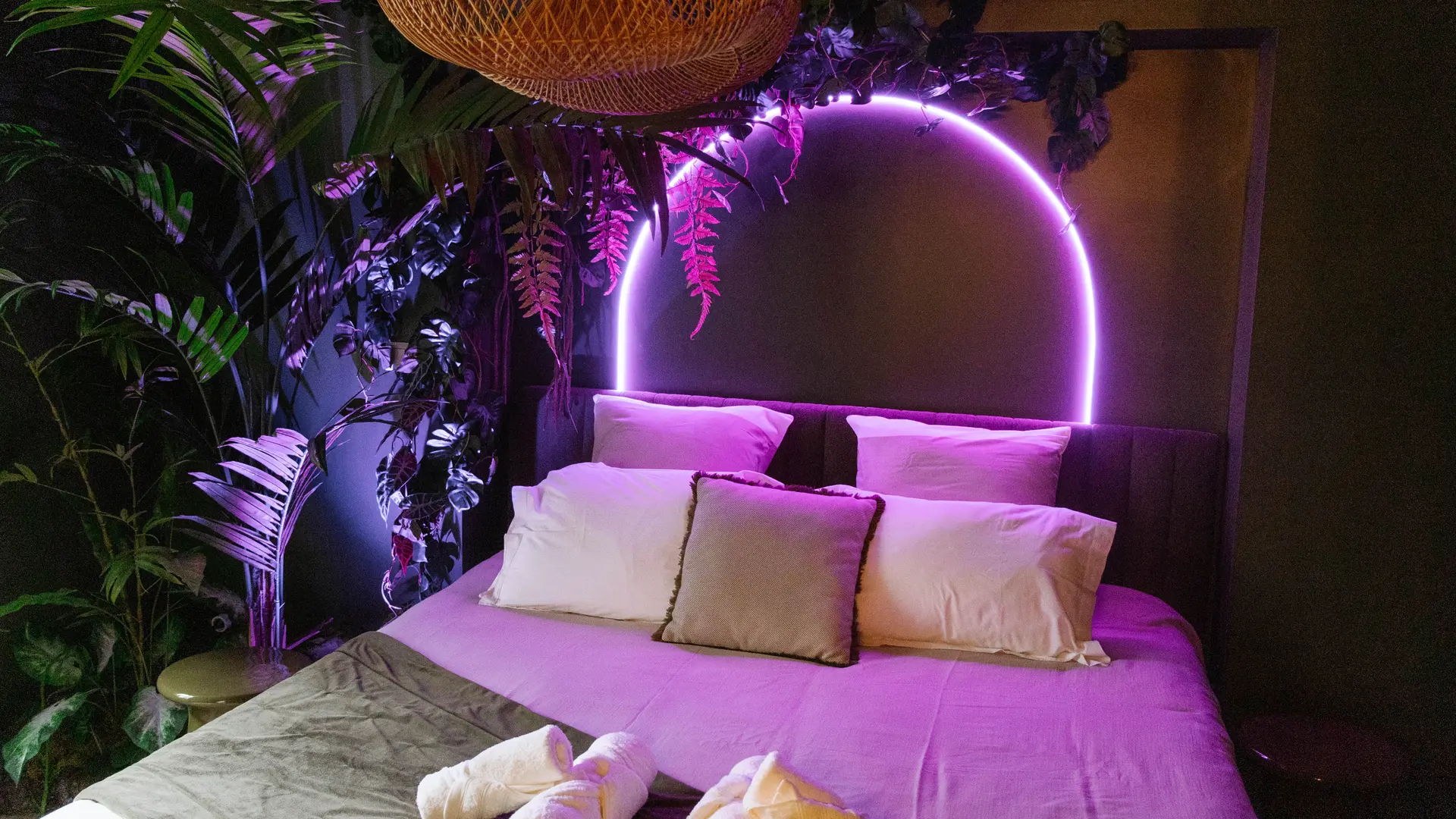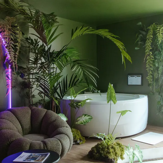 The Jungle Room consists of a comfortable bedroom with a 180cm bed and en-suite shower room with toilet, and a cosy kitchen/living room with whirlpool bath, so you can relax and enjoy your stay to the full.