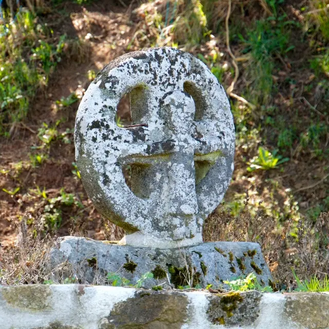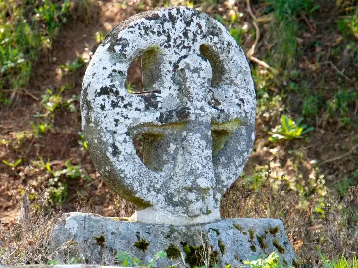 The cross is set on a stone base. It is entirely inscribed within a square, openwork circle with blunt corners. The north face is carved with the effigy of Christ crucified. The head, whose features are barely visible, is 1/3 the size of the body. He is dressed in a long robe reaching down to mid-leg. The cross may be Romanesque, or it may be more recent if it is a reworking of ancient techniques.