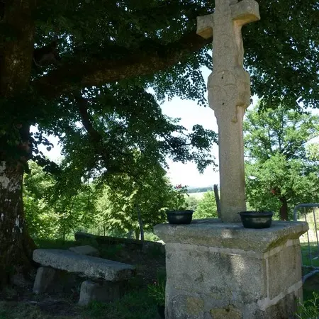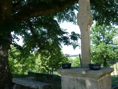 Monumental granite cross erected by the Hospitallers, decorated with a Mystic Lamb, two crosses pattées and a rose window.
