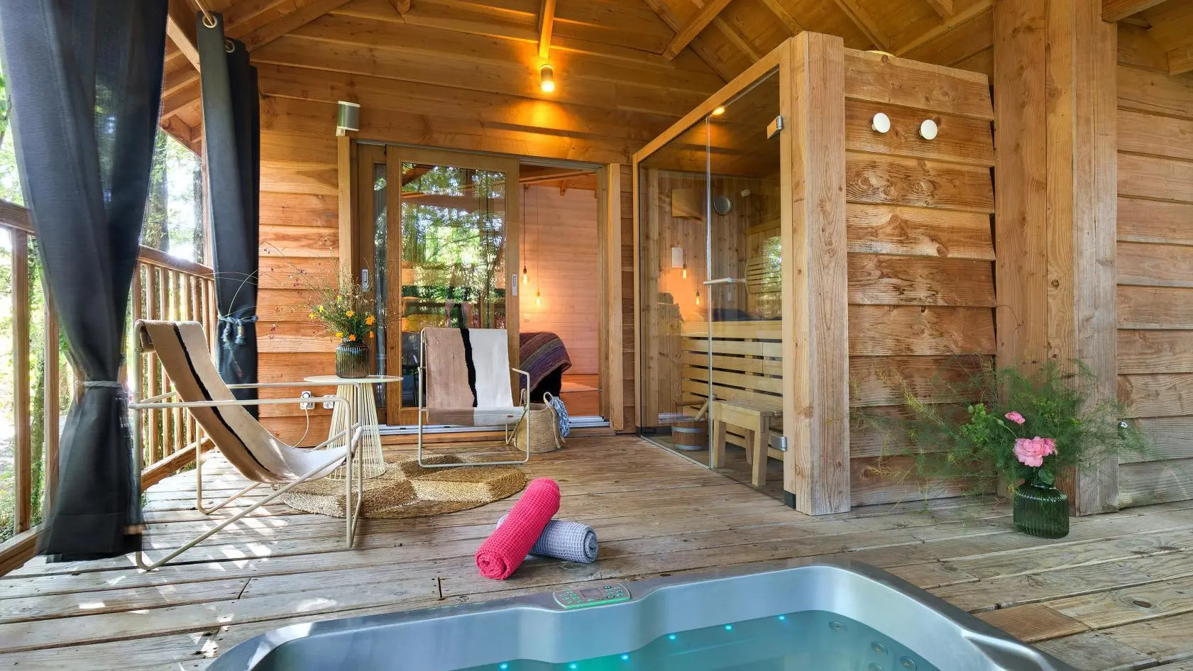 Nestled in the heart of a private wood in Saint-Mexant, Corrèze, the Cyprès si Haut tree house offers an unforgettable experience. Accessed by an elegant spiral staircase, this 80 m² cabin, including a large terrace, combines natural charm with top-of-the-range amenities. Treat yourself to a moment of well-being in the private spa and sauna, located on this out-of-sight terrace. Inside, comfort and modernity meet: a master suite, a mezzanine for the children, a fully equipped kitchen, a bioethanol stove, air conditioning, a connected speaker, a TV and Wi-Fi. Numerous activities await you: forest walks, fishing, canoeing, horseback riding, and discovering the Château de Sédières and the charming villages of Correze. Whether you're looking for an unusual, romantic or family night out, Cyprès si Haut is a haven of peace where ...