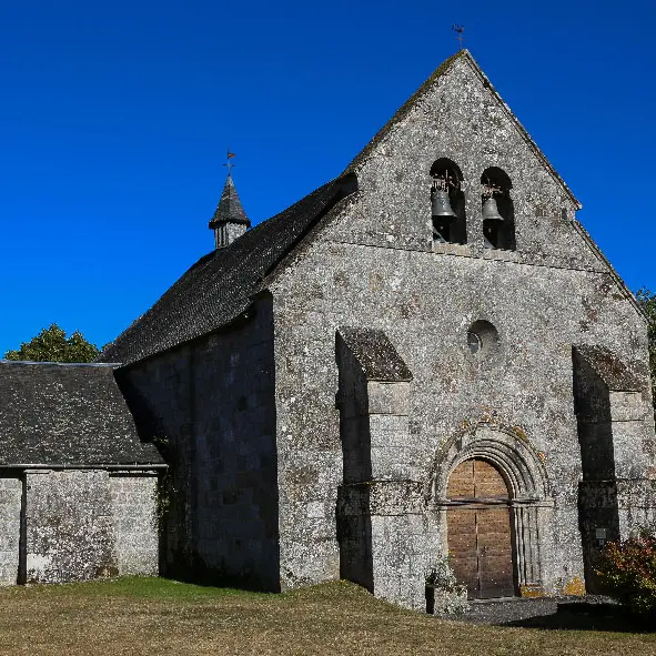 The church at Moustier-Ventadour was originally the chapel of a Benedictine priory founded under the obedience of Cluny by Viscount Ebles II in the early 12th century. The church was rebuilt in 1494. The current building is the result of the rebuilding of this chapel, of which the cornice of the chevet remains on the outside and the columns of the triumphal arch with their capitals on the inside, as well as two bays on the south façade. The west facade was restored in 1786.