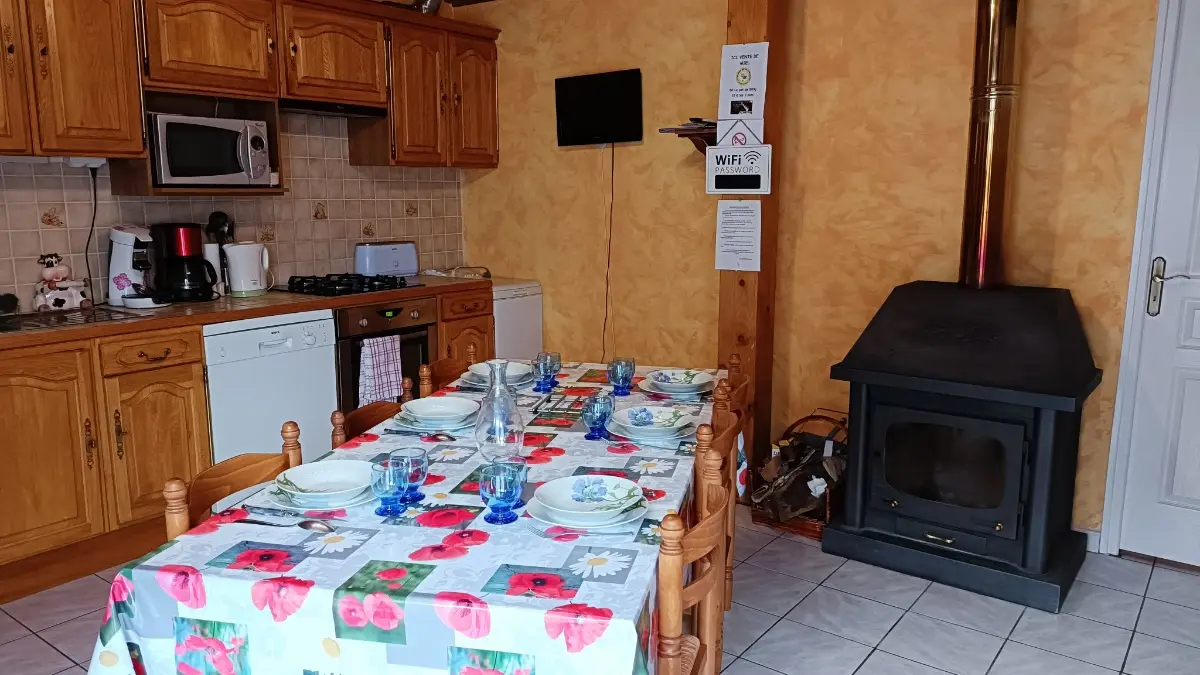 The kitchen is fully equipped, with a large, pleasant living area featuring a wood-burning stove.