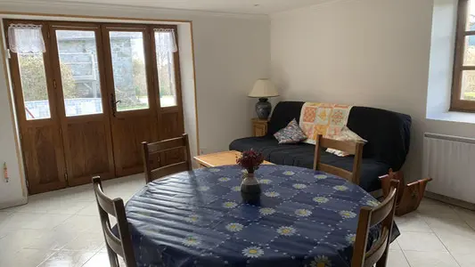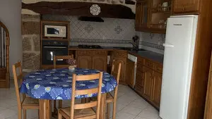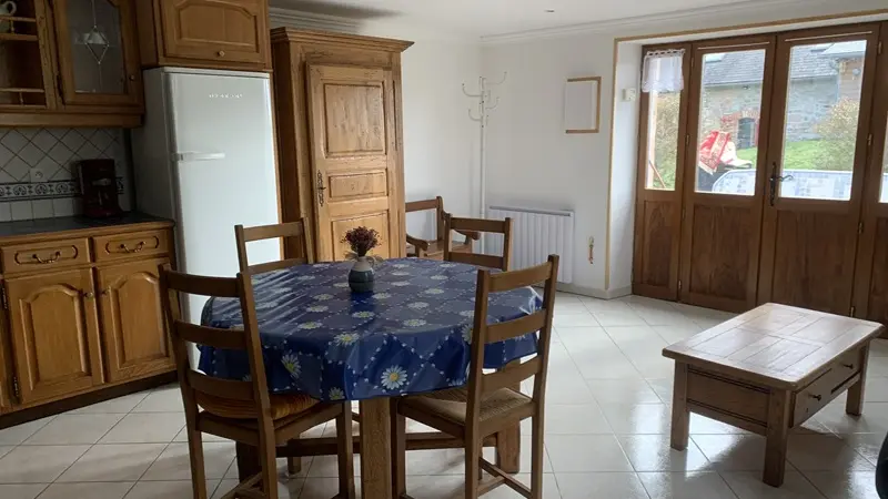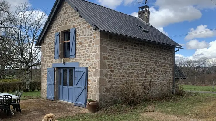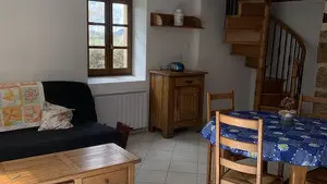 A cosy nest in the heart of the Millevaches plateau! Charming with its blue shutters, this former bakery has been converted into a gîte for 2 or 4 people (sofa bed). On the ground floor, you'll find a living room with a well-equipped kitchen (mini-oven, fridge, washing machine, small appliances), a round table to enjoy local produce, and a sofa area for reading or chatting - disconnection guaranteed (no TV, no WiFi). A spiral staircase leads to the bedroom (1 bed 140, linen supplied) and bathroom. The atmosphere is simple and warm.