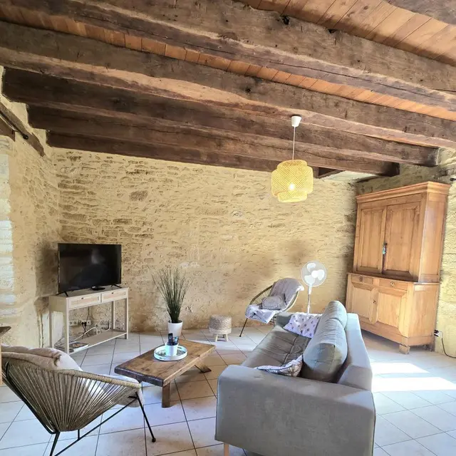 In the Périgord Noir region, 15 minutes from Sarlat, this stone house is typical of the region, with a large living room featuring exposed stone walls and beautiful beams.