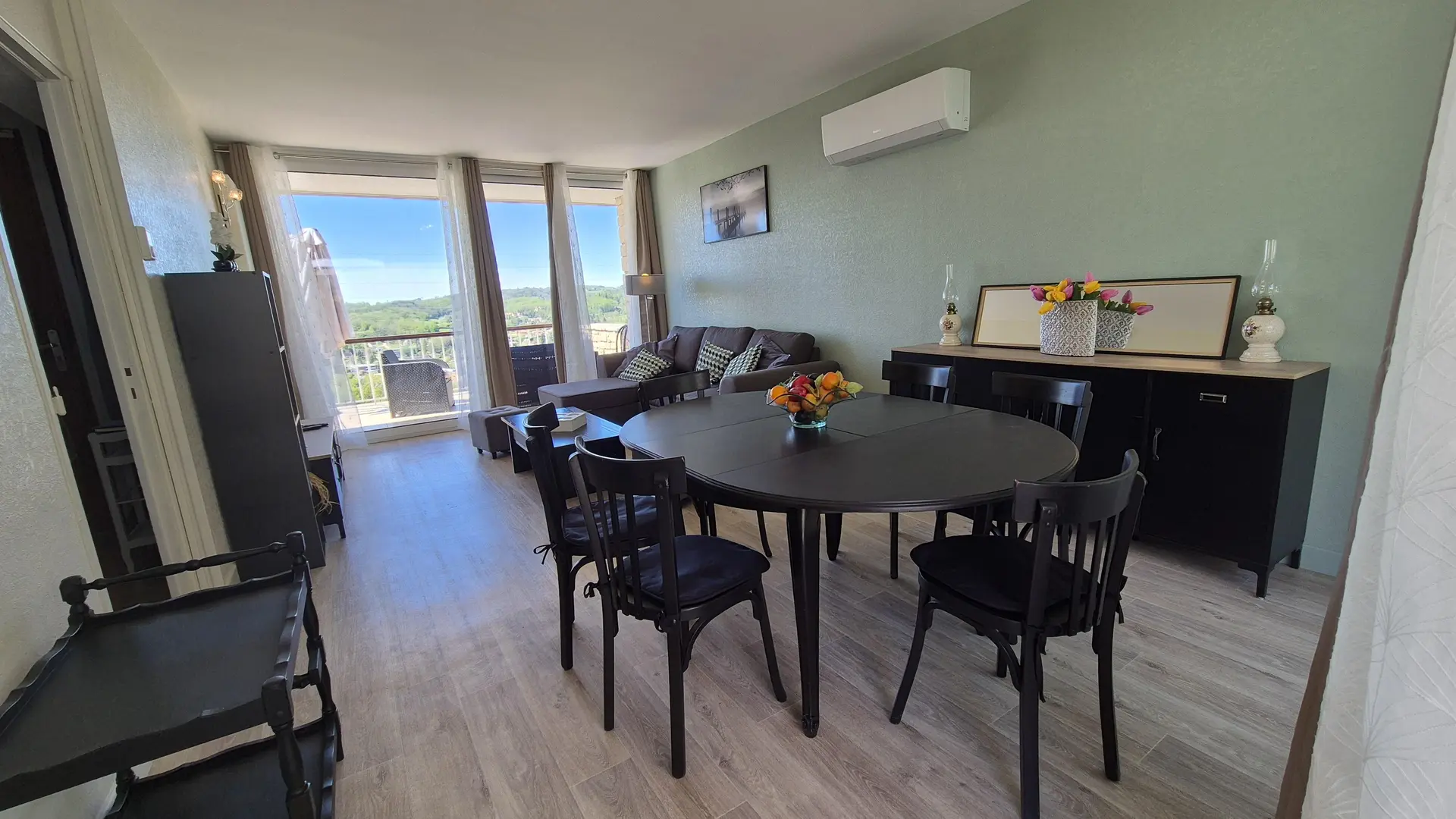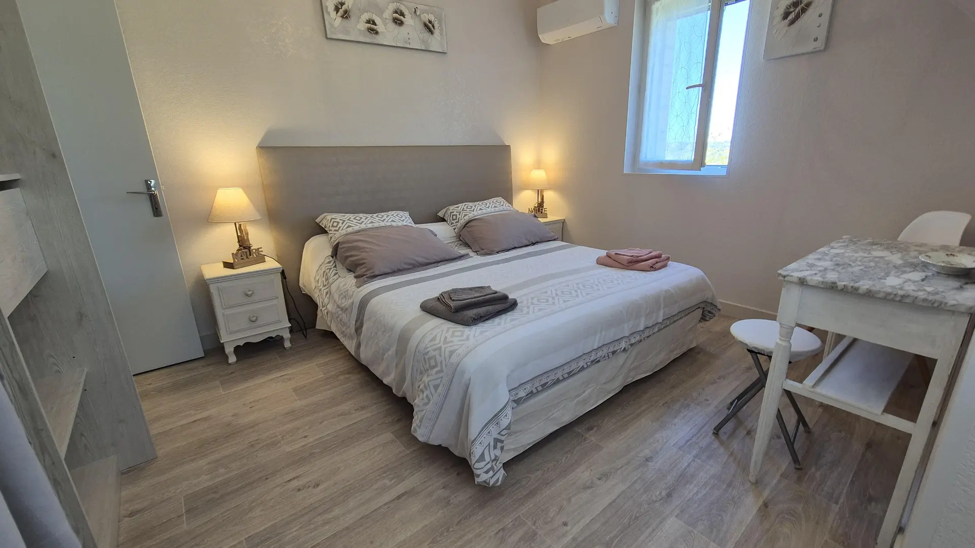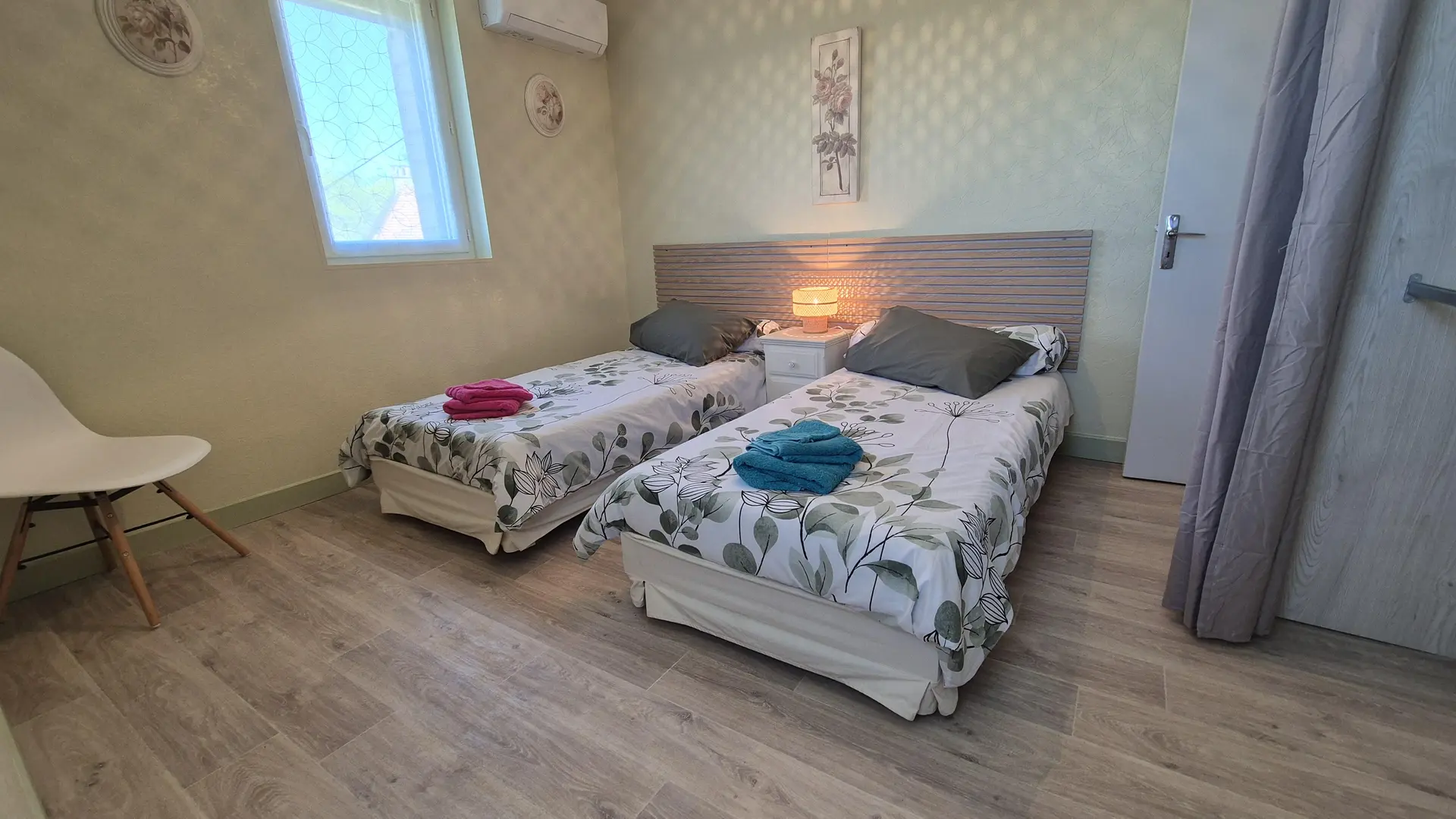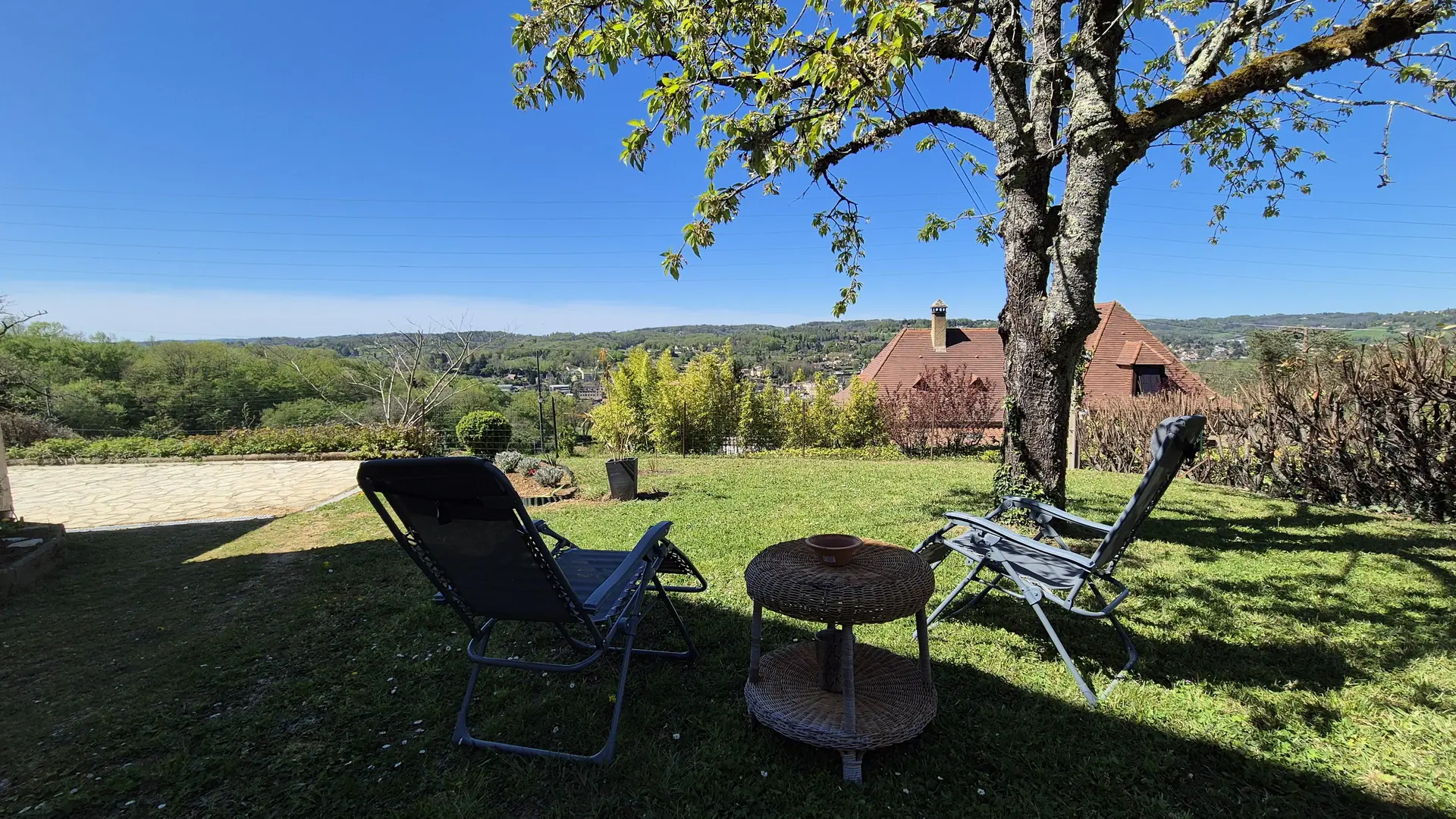 Fully air-conditioned house located on the heights of Sarlat, less than 2 km from the historic center, offering unobstructed views and a peaceful setting. This bright, comfortable home can accommodate up to 5 people and boasts spacious accommodation. Upstairs, the sleeping area comprises 1 air-conditioned double bedroom with large closet and dressing table, 1 air-conditioned bedroom with two single beds and ample storage space, and a third bedroom suitable for an adult or child. A safety gate protects access to the staircase, ideal for families. The bathroom is large, modern and functional, with a large walk-in shower, vanity unit with storage space, washing machine and window providing natural light. 1 separate toilet. On the first floor, you'll find a bright, air-conditioned living room with large windows opening onto the terraces,