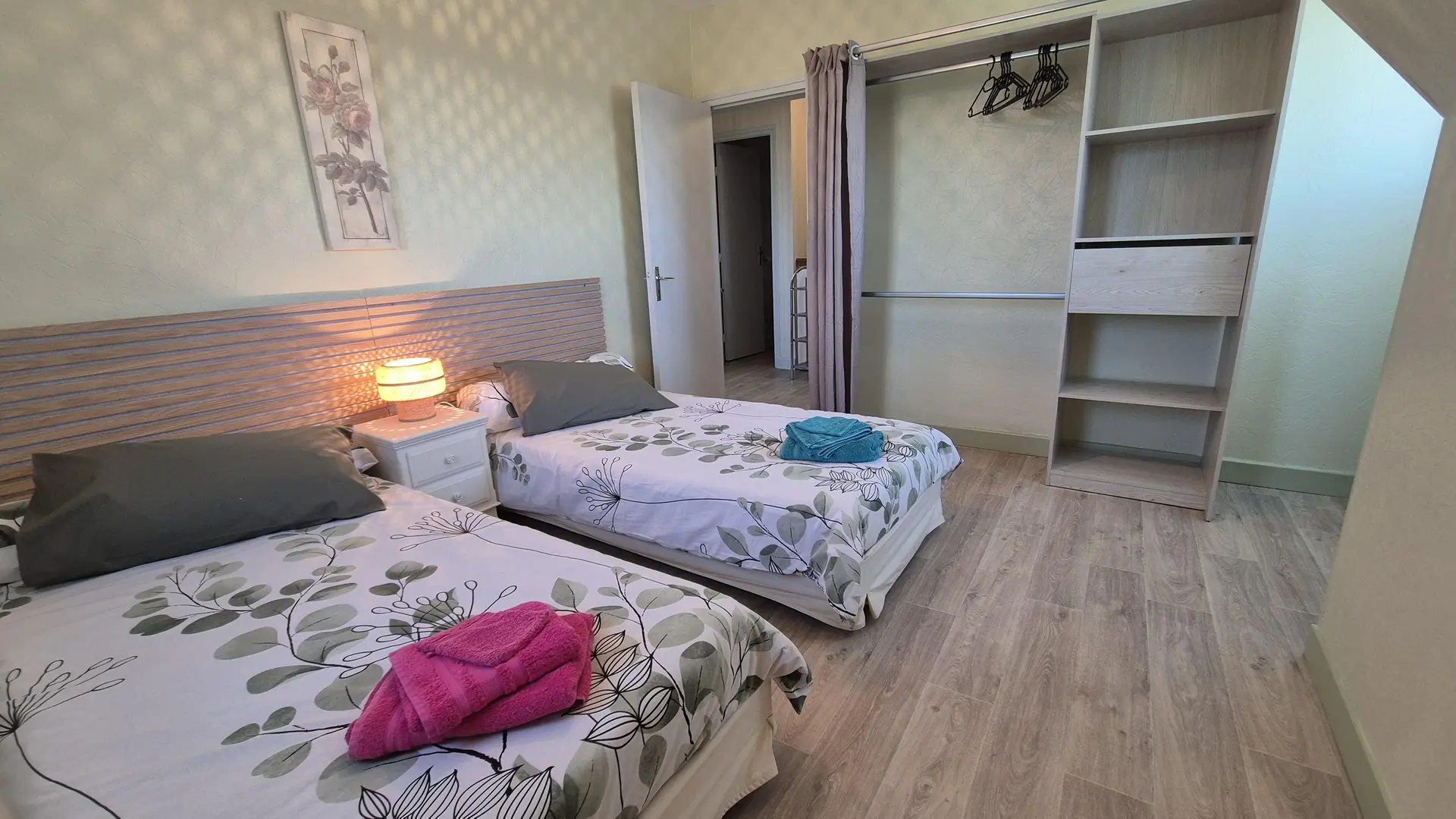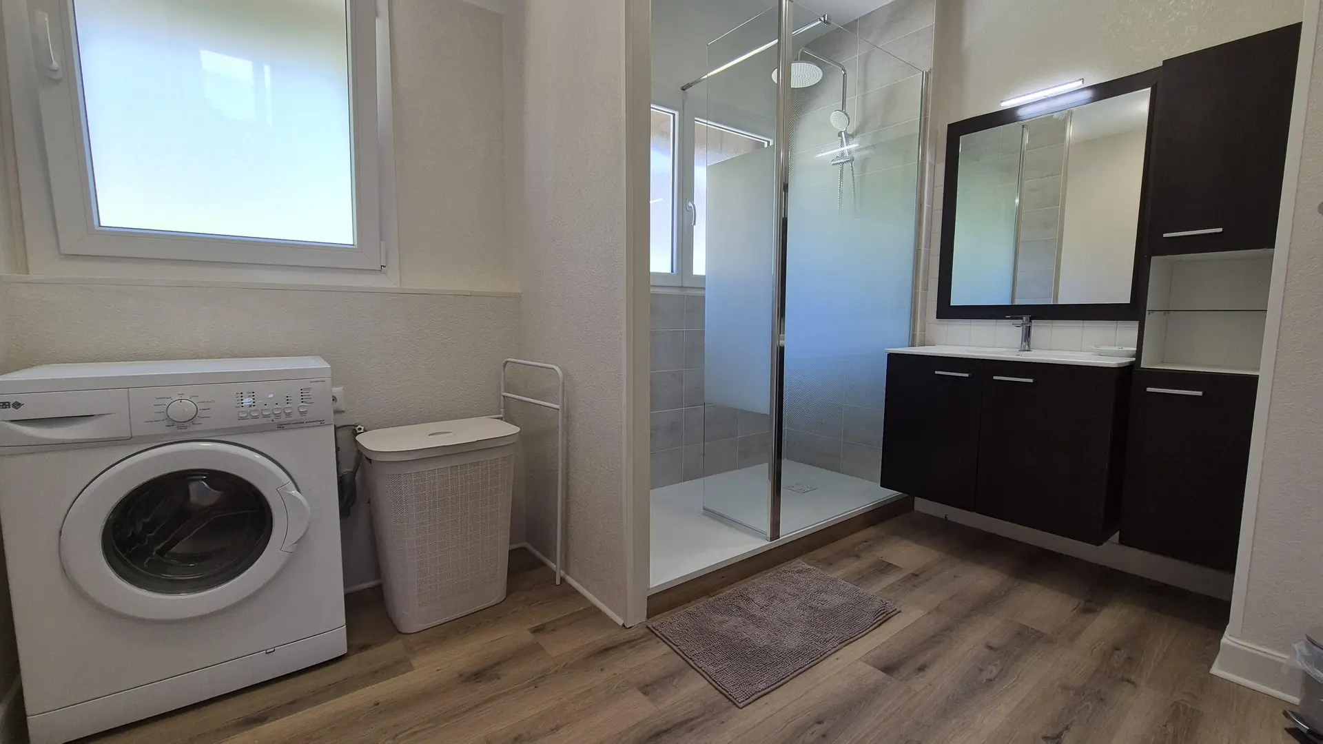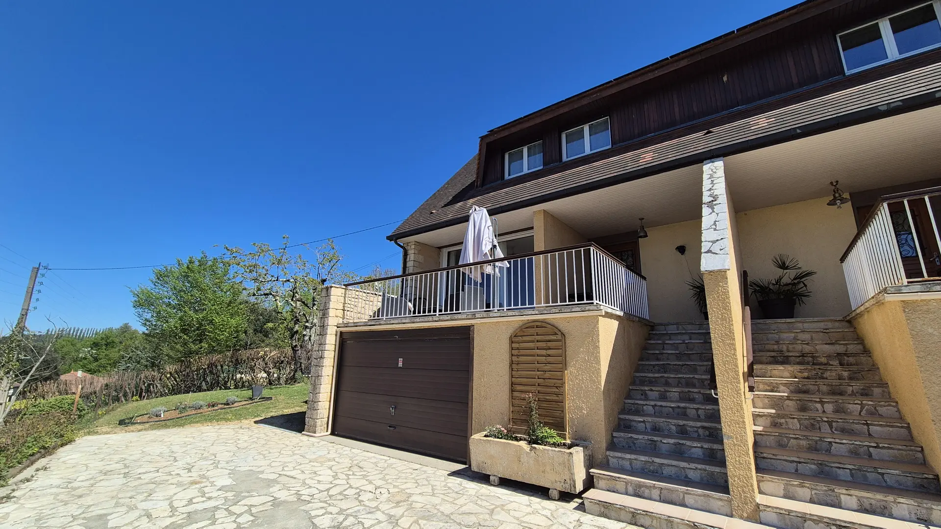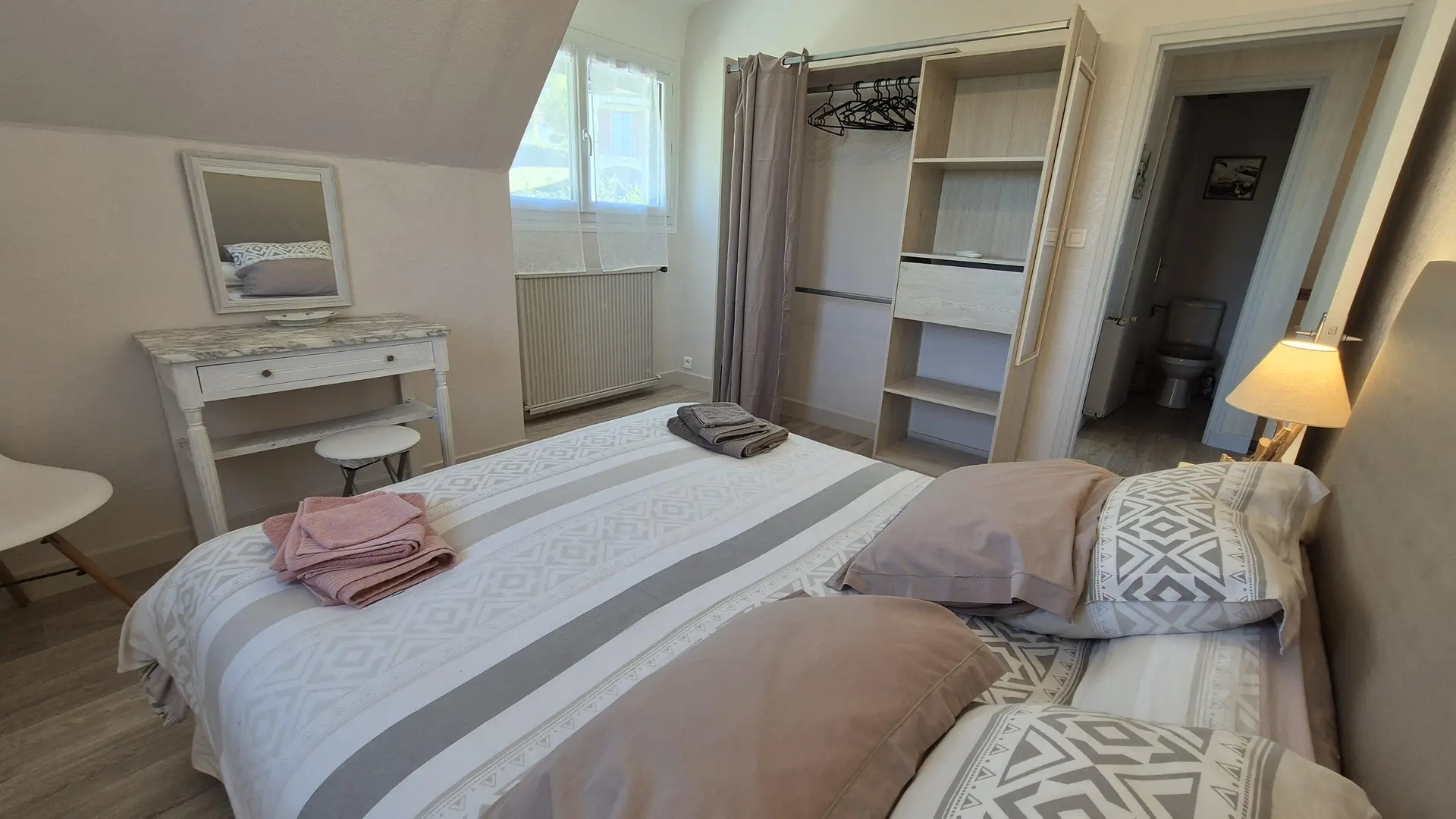 Fully air-conditioned house located on the heights of Sarlat, less than 2 km from the historic center, offering unobstructed views and a peaceful setting. This bright, comfortable home can accommodate up to 5 people and boasts spacious accommodation. Upstairs, the sleeping area comprises 1 air-conditioned double bedroom with large closet and dressing table, 1 air-conditioned bedroom with two single beds and ample storage space, and a third bedroom suitable for an adult or child. A safety gate protects access to the staircase, ideal for families. The bathroom is large, modern and functional, with a large walk-in shower, vanity unit with storage space, washing machine and window providing natural light. 1 separate toilet. On the first floor, you'll find a bright, air-conditioned living room with large windows opening onto the terraces,