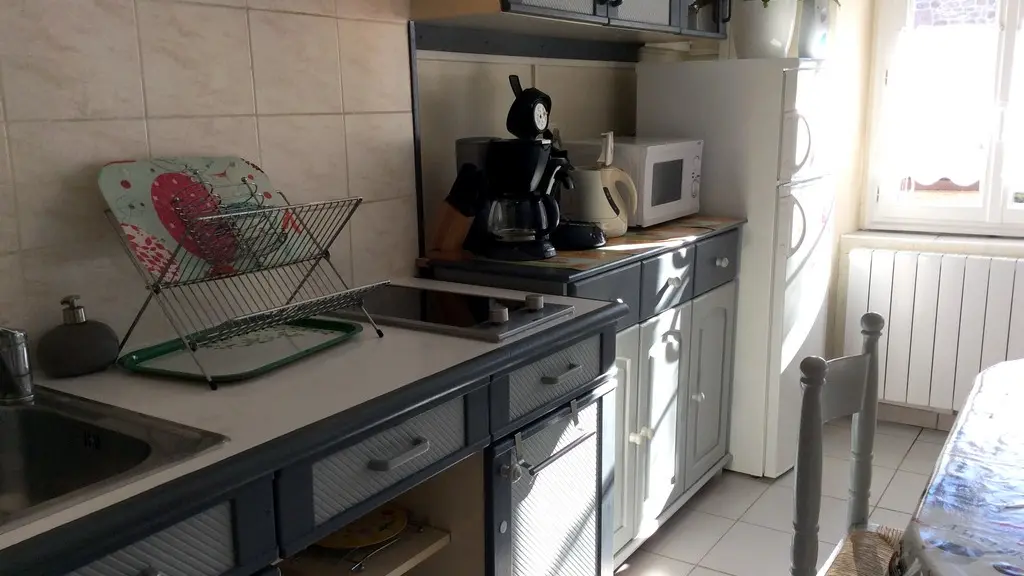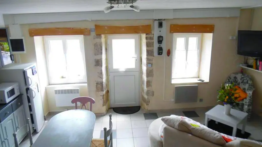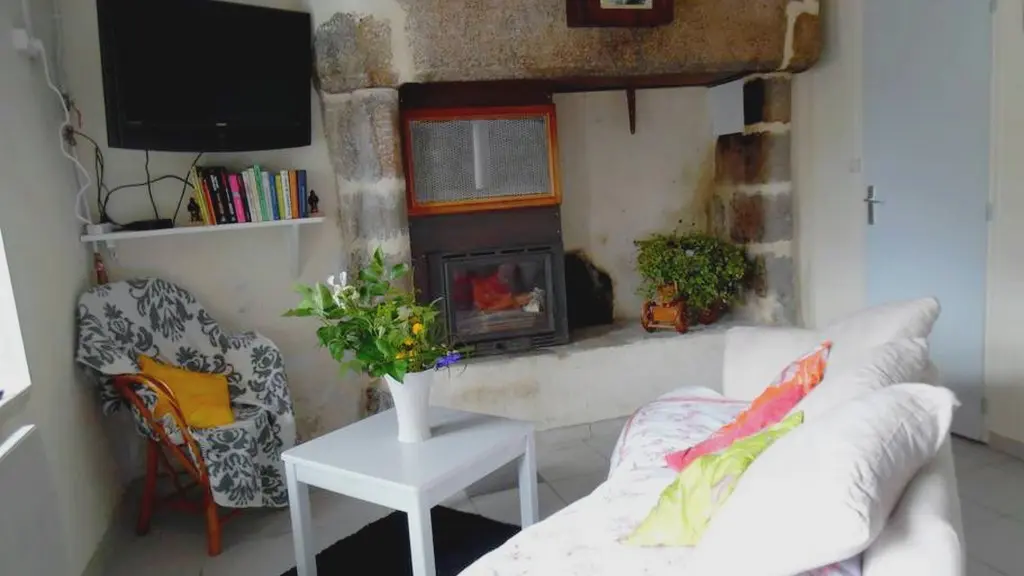 In the centre of the village of Viam, in the heart of the Parc Naturel Régional de Millevaches, push open the white gate, go through the pretty enclosed courtyard full of flowers and enter this adorable little house designed to accommodate 4 people. The accommodation is composed on the garden level of a living room with its integrated kitchen (washing machine, dishwasher), a dining area and a relaxation area (TV) facing the old fireplace equipped with an insert for more comfort.
