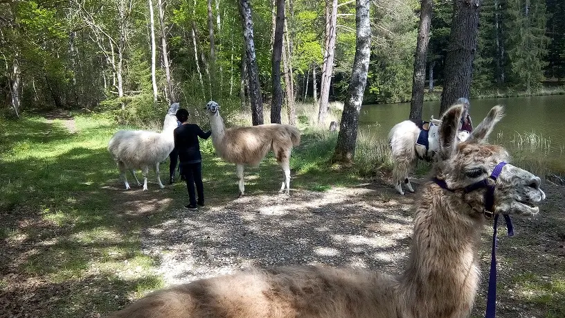 Several formulas: guided tour and walk with a llama on a tether; llama agility workshop; birthday party and treasure hunt with llamas; hike with at least two llamas.