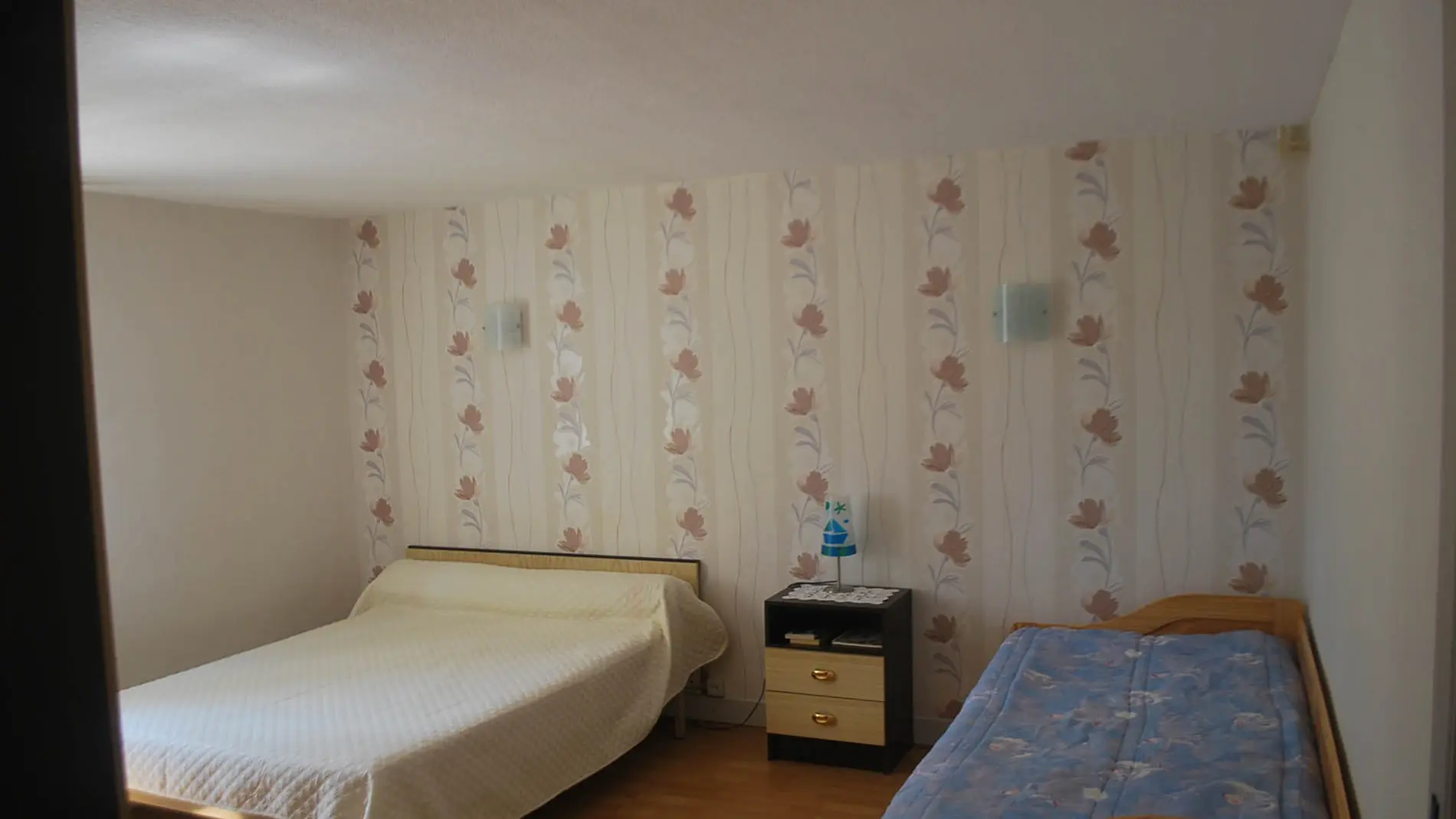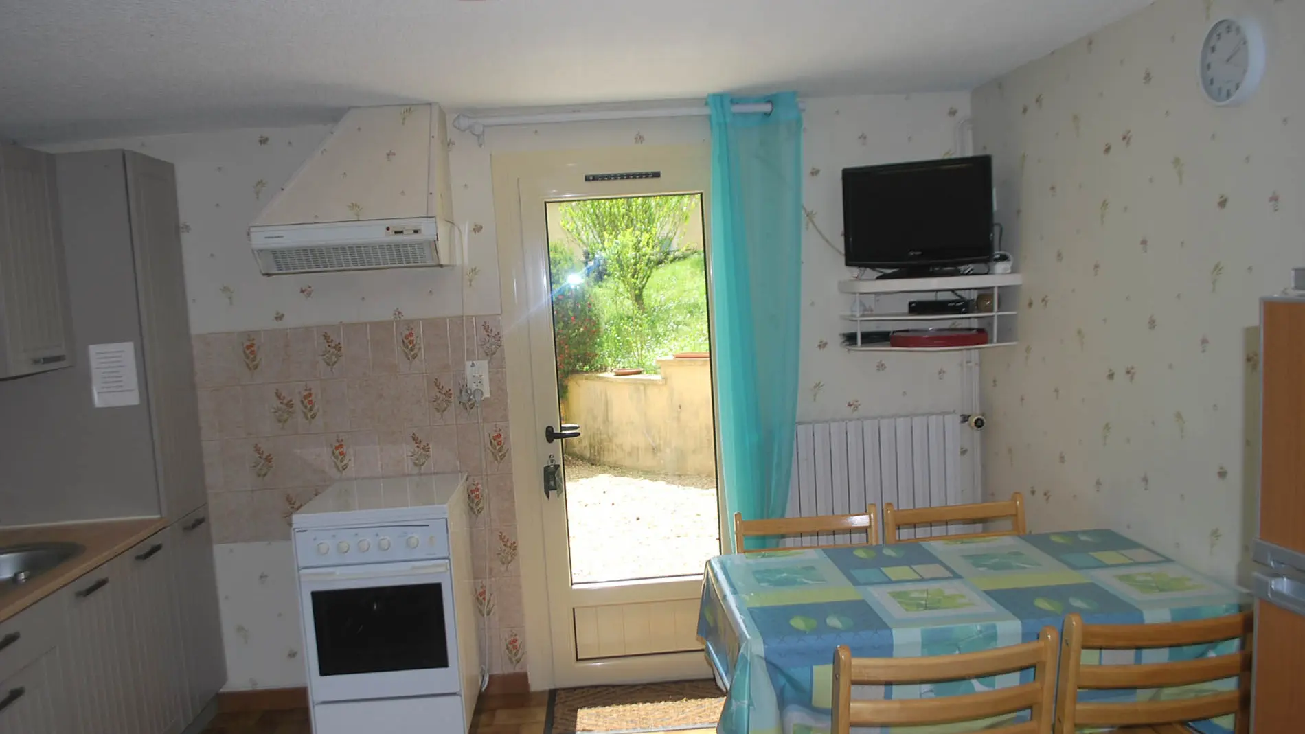 cuisine / salle à manger, TV, 1 grande chambre avec 1 lit de 140 et 1 lit de 90, sanitaire avec douche, lavabo et WC. Wifi, GB parlé.