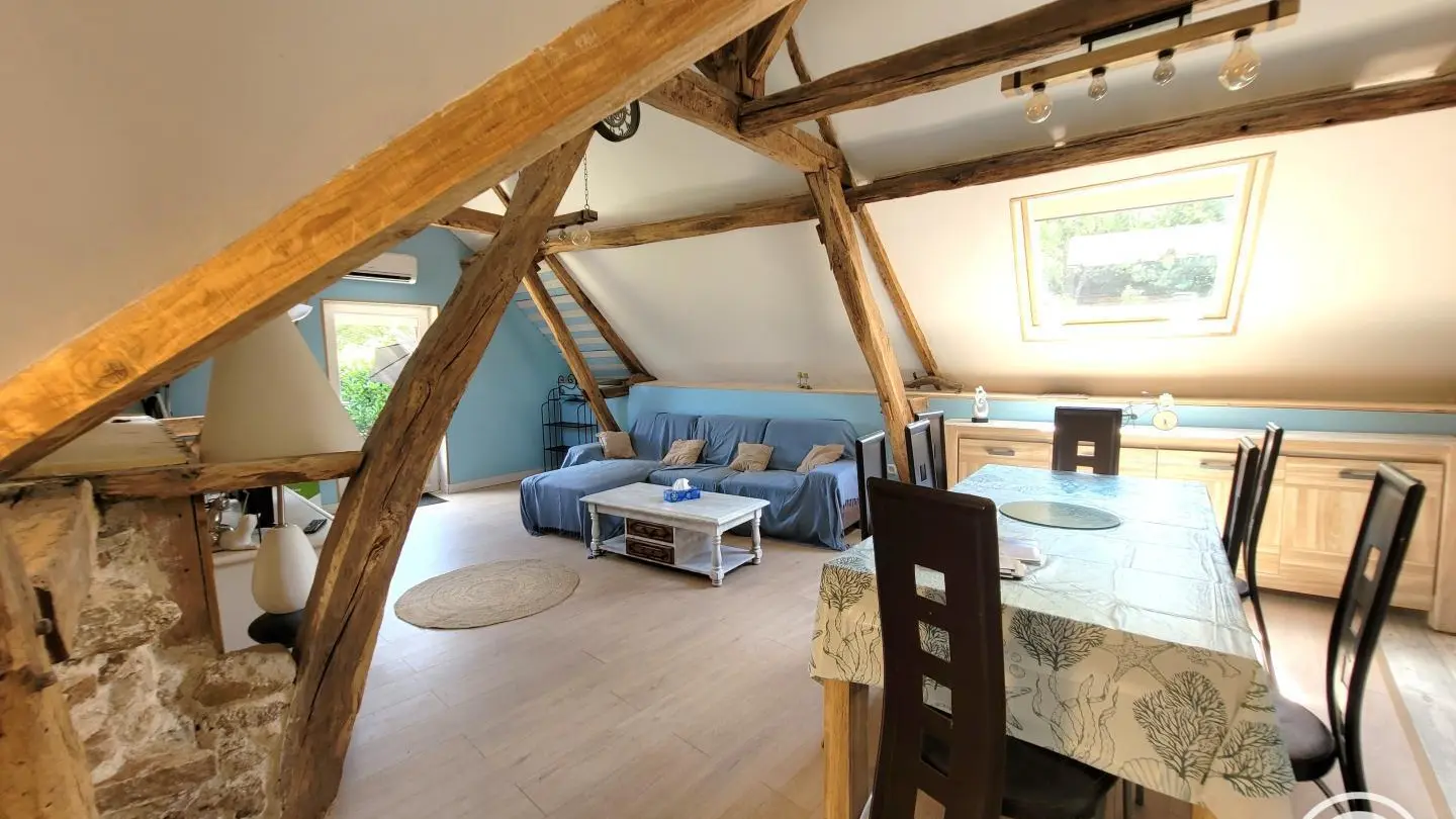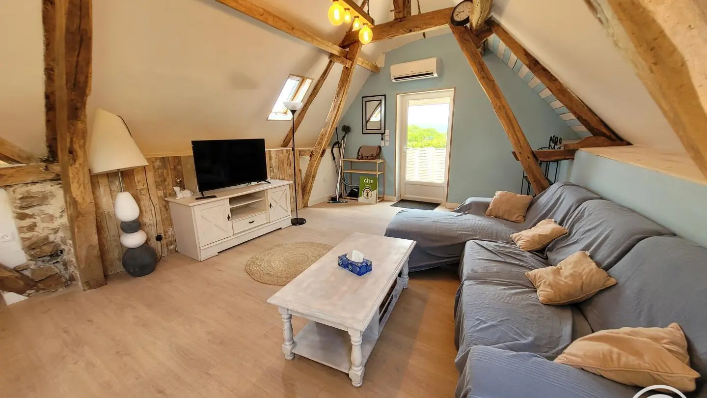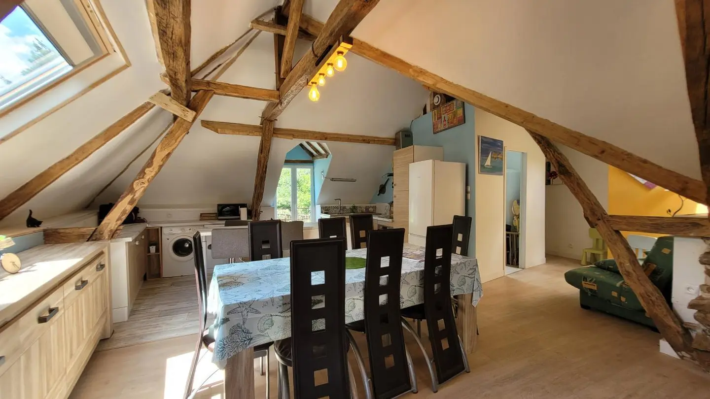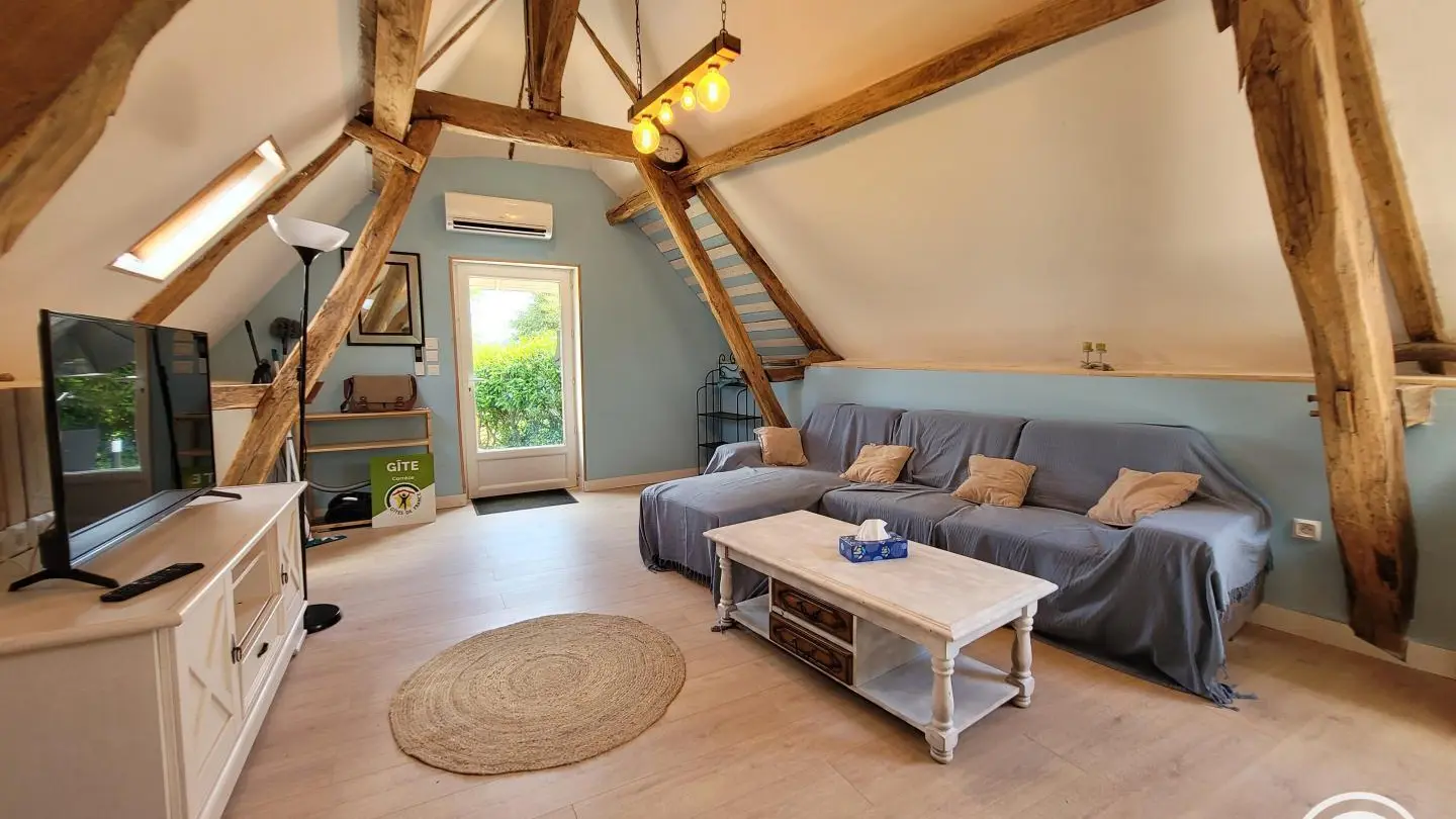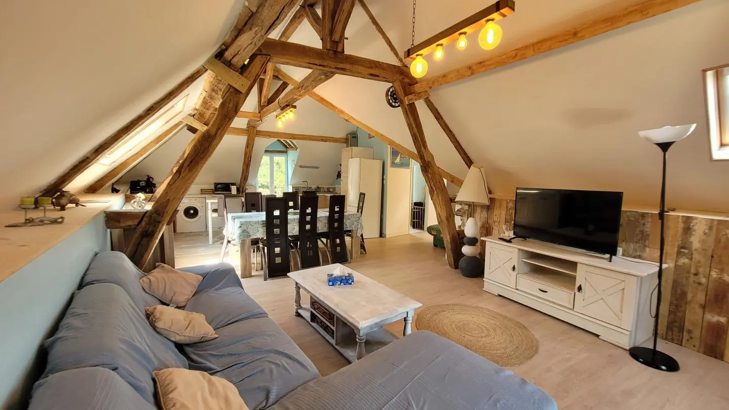 Completely restored stone barn with slate roof. - Red shutters frame a French window opening onto a small stone staircase. - Terrace equipped with garden furniture and barbecue, ideal for outdoor meals. - Quiet, leafy setting with plants and shrubs. Inside, a large attic living area with exposed wooden beams, comfortable sitting area with sofa, coffee table and TV. - Dining area with large table and chairs, fully-equipped kitchen open to the living room. -The warm, rustic decor combines modernity with elements of yesteryear. This gîte is perfect for a stay with family or friends, offering all the comforts needed to spend pleasant, relaxing moments.