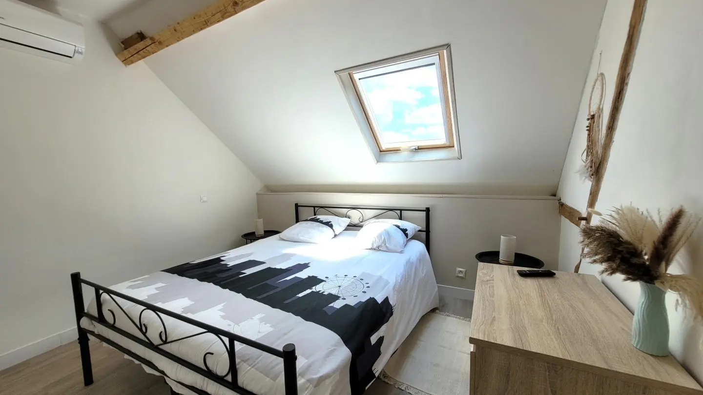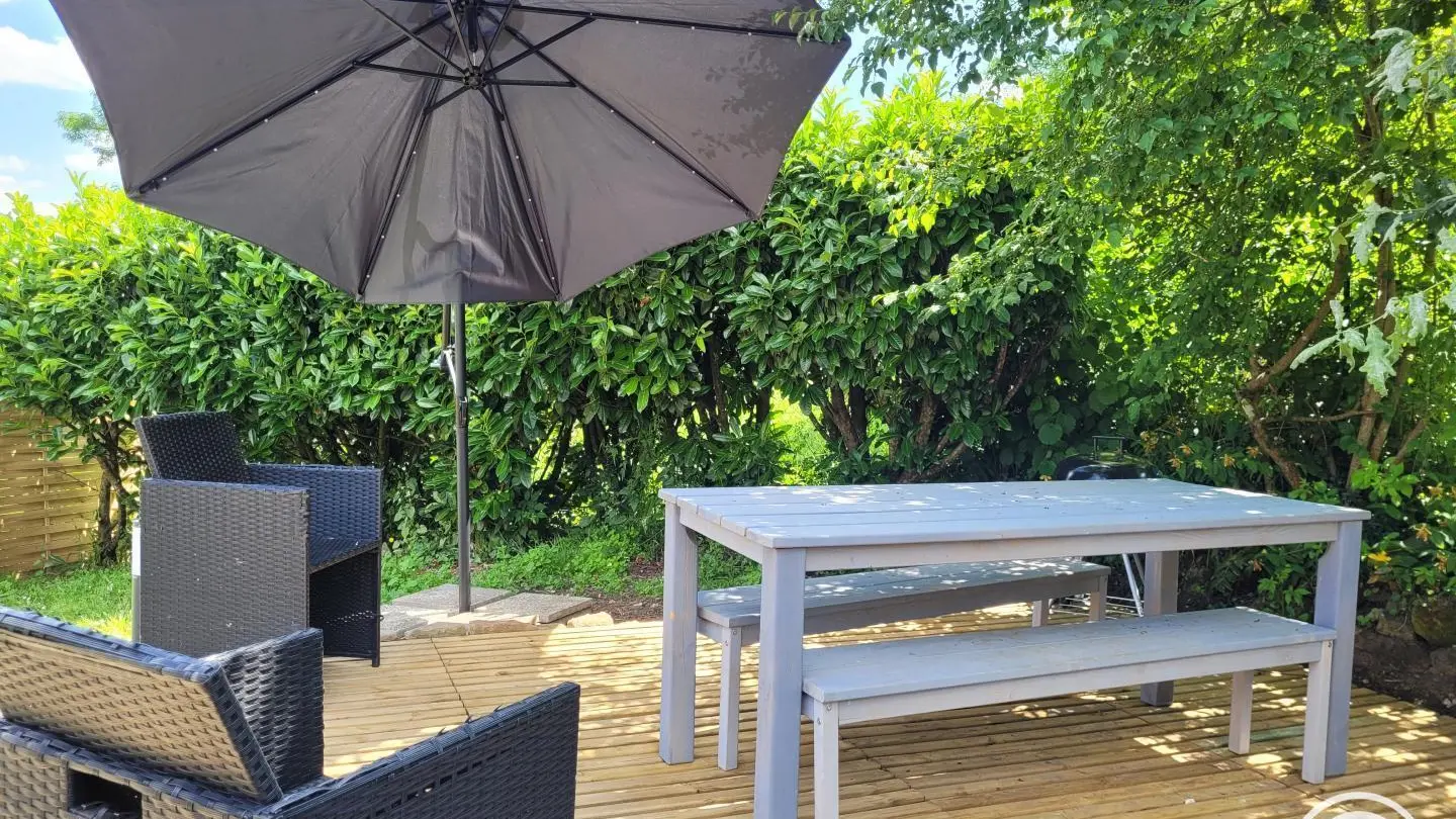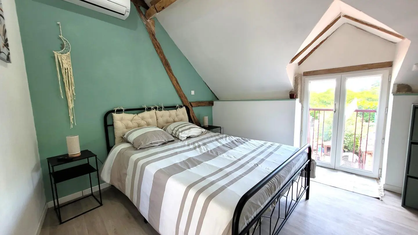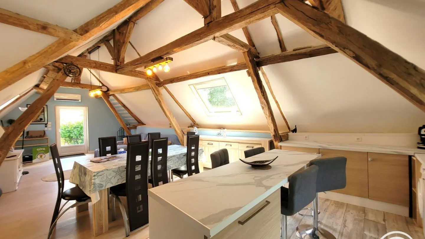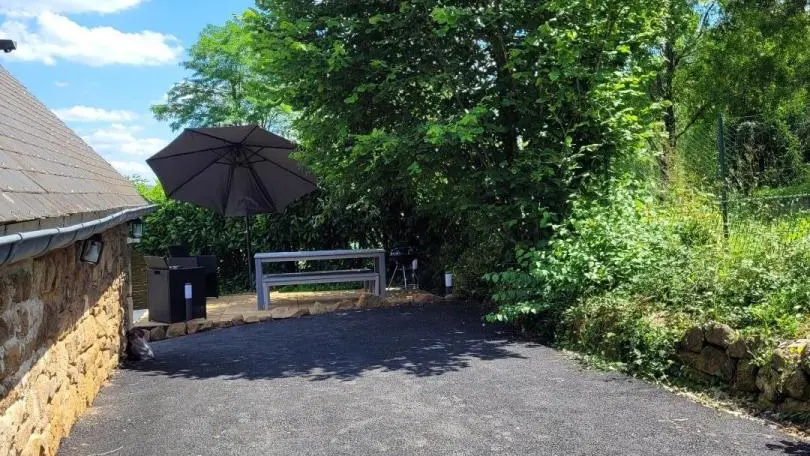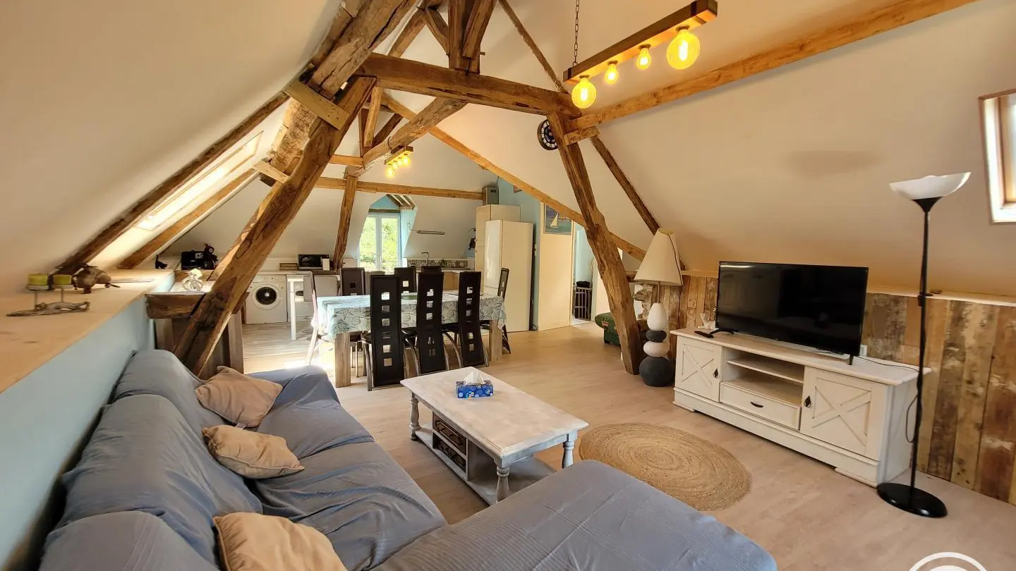 Completely restored stone barn with slate roof. - Red shutters frame a French window opening onto a small stone staircase. - Terrace equipped with garden furniture and barbecue, ideal for outdoor meals. - Quiet, leafy setting with plants and shrubs. Inside, a large attic living area with exposed wooden beams, comfortable sitting area with sofa, coffee table and TV. - Dining area with large table and chairs, fully-equipped kitchen open to the living room. -The warm, rustic decor combines modernity with elements of yesteryear. This gîte is perfect for a stay with family or friends, offering all the comforts needed to spend pleasant, relaxing moments.