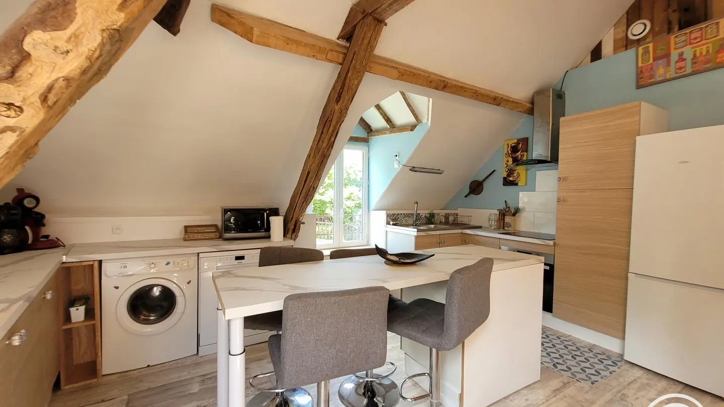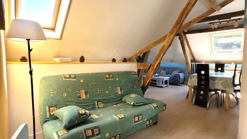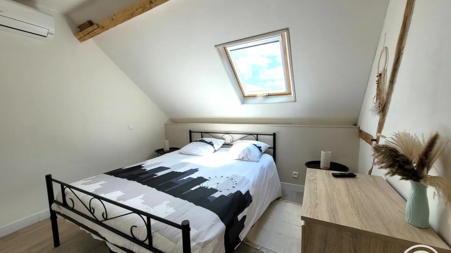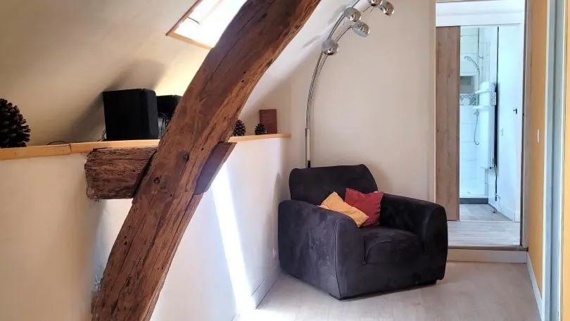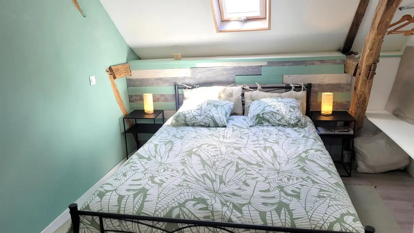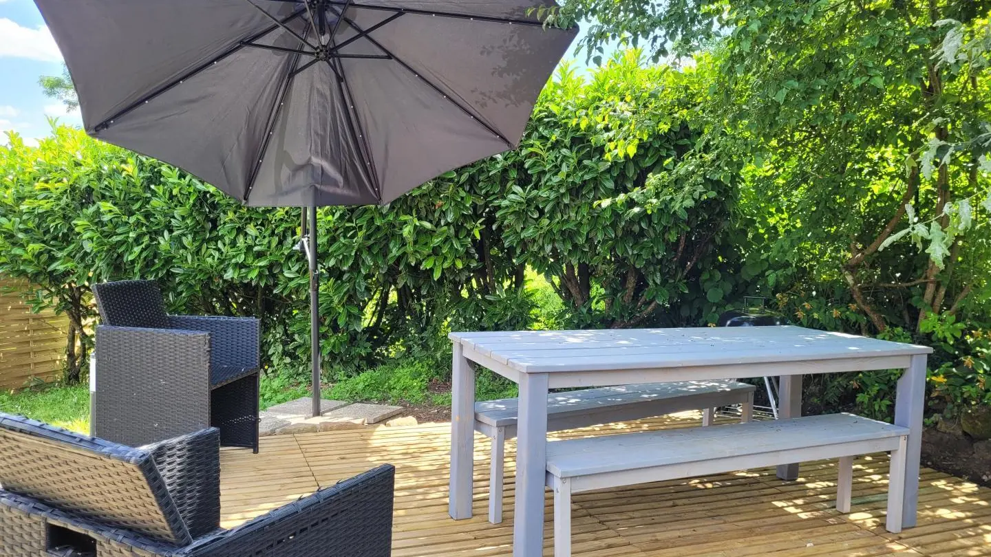 Completely restored stone barn with slate roof. - Red shutters frame a French window opening onto a small stone staircase. - Terrace equipped with garden furniture and barbecue, ideal for outdoor meals. - Quiet, leafy setting with plants and shrubs. Inside, a large attic living area with exposed wooden beams, comfortable sitting area with sofa, coffee table and TV. - Dining area with large table and chairs, fully-equipped kitchen open to the living room. -The warm, rustic decor combines modernity with elements of yesteryear. This gîte is perfect for a stay with family or friends, offering all the comforts needed to spend pleasant, relaxing moments.