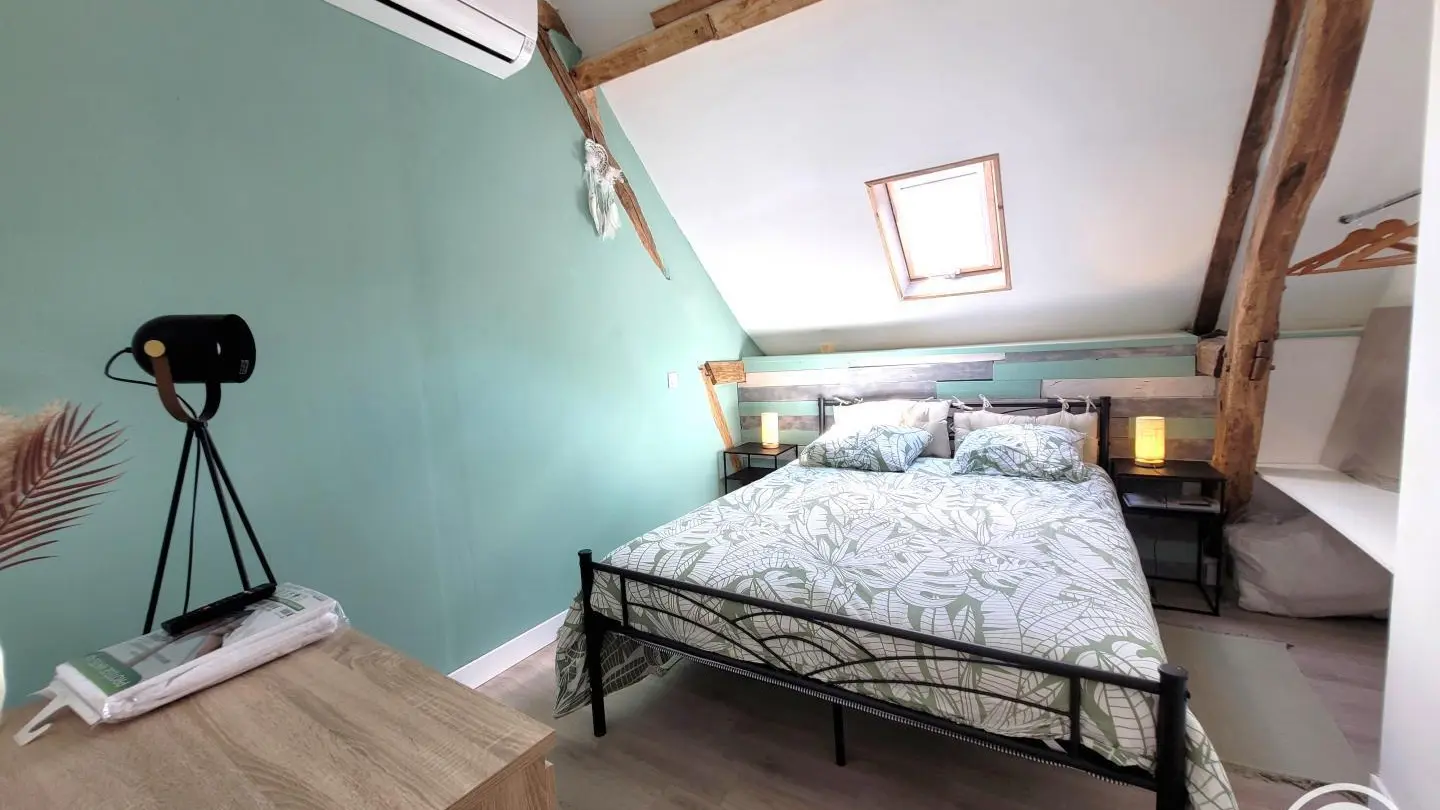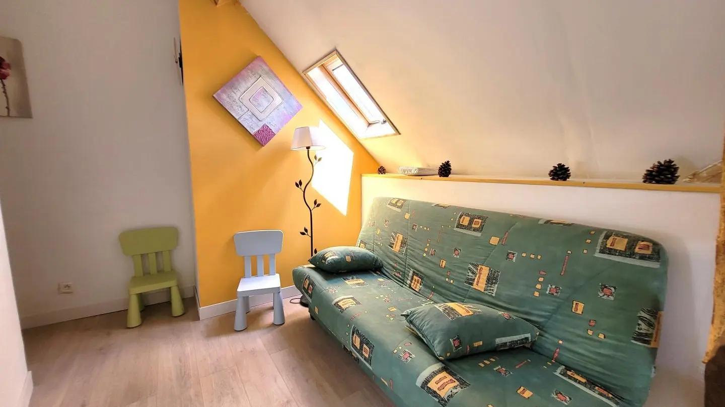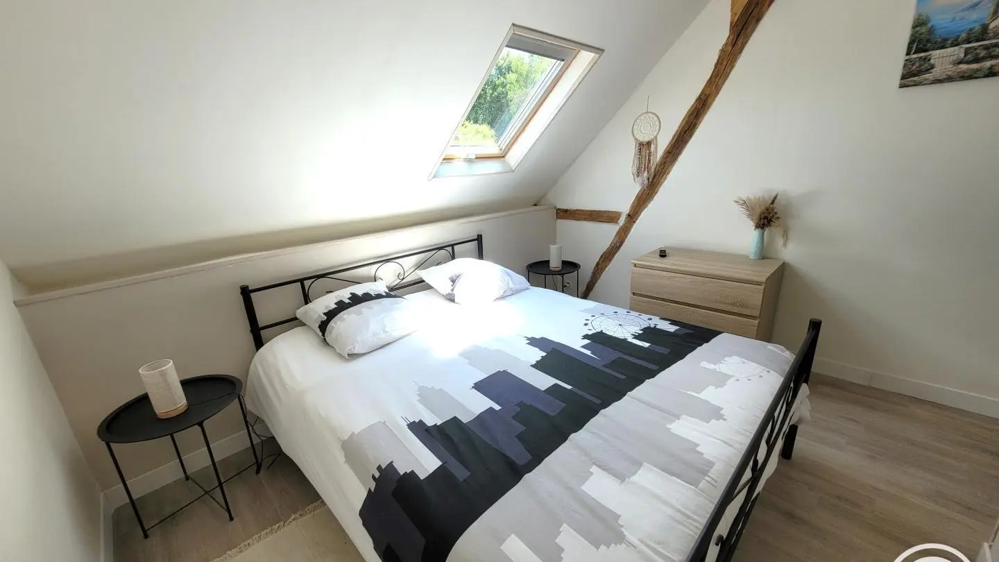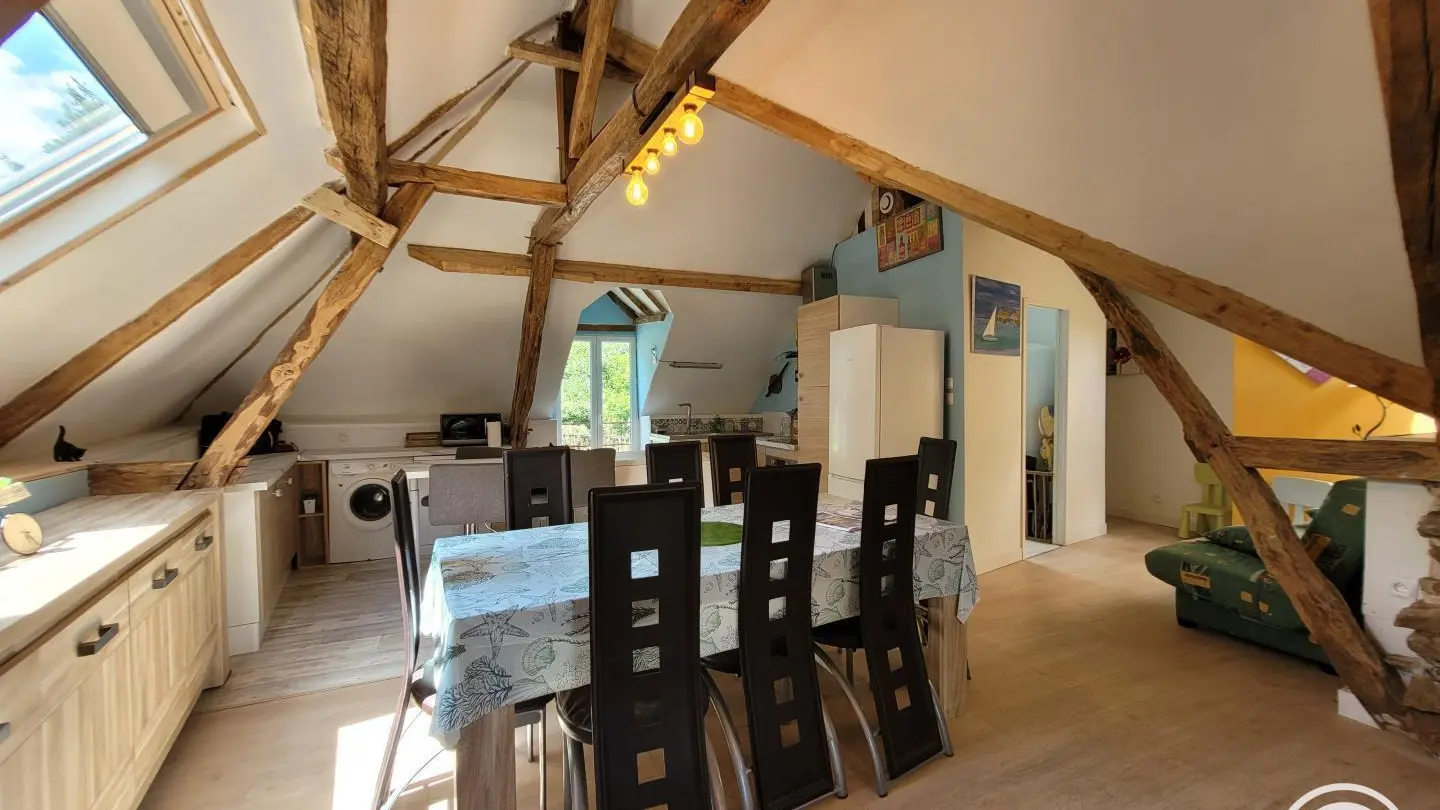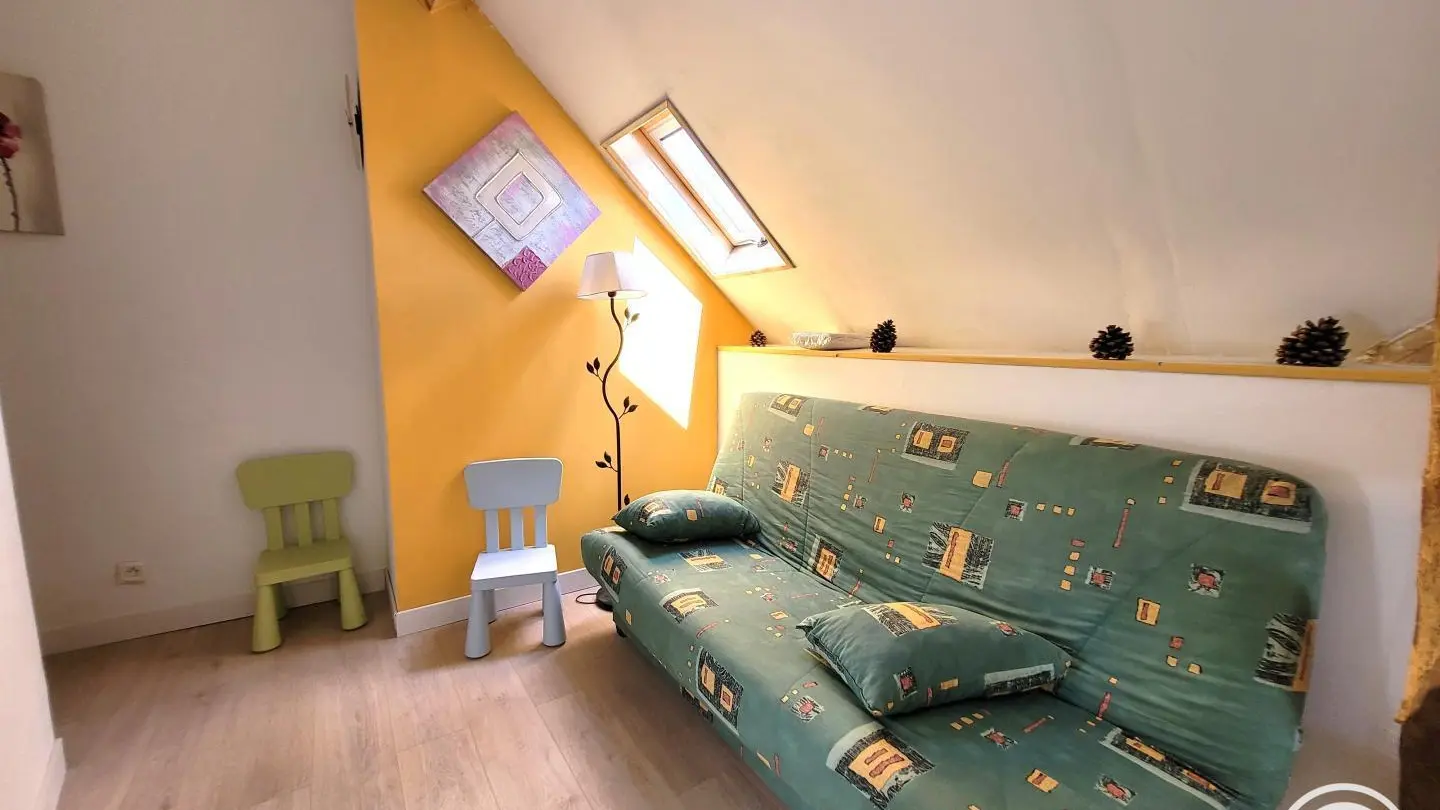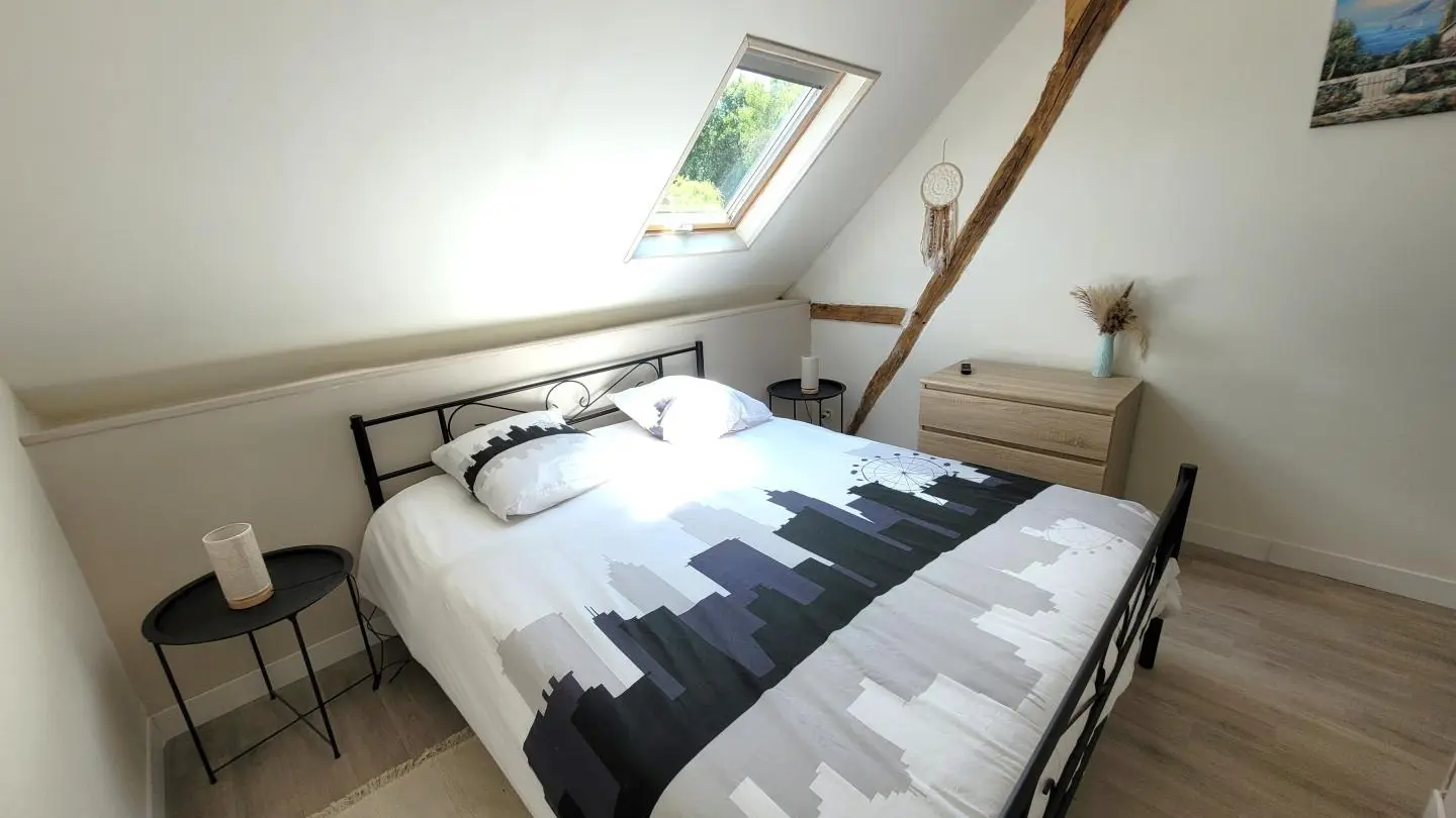Completely restored stone barn with slate roof. - Red shutters frame a French window opening onto a small stone staircase. - Terrace equipped with garden furniture and barbecue, ideal for outdoor meals. - Quiet, leafy setting with plants and shrubs. Inside, a large attic living area with exposed wooden beams, comfortable sitting area with sofa, coffee table and TV. - Dining area with large table and chairs, fully-equipped kitchen open to the living room. -The warm, rustic decor combines modernity with elements of yesteryear. This gîte is perfect for a stay with family or friends, offering all the comforts needed to spend pleasant, relaxing moments.