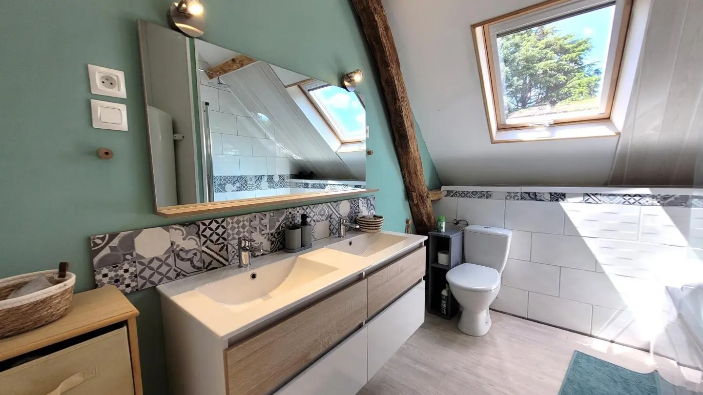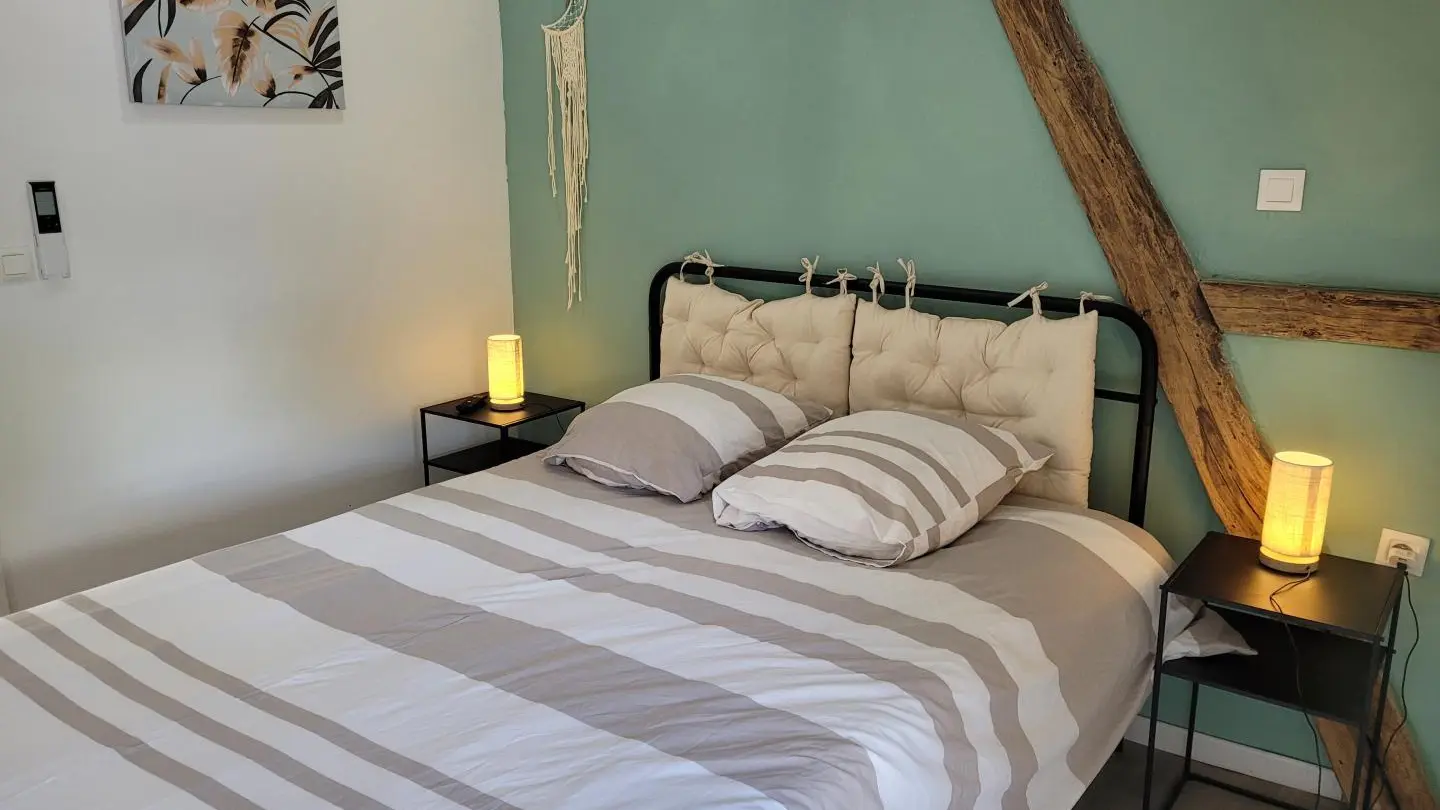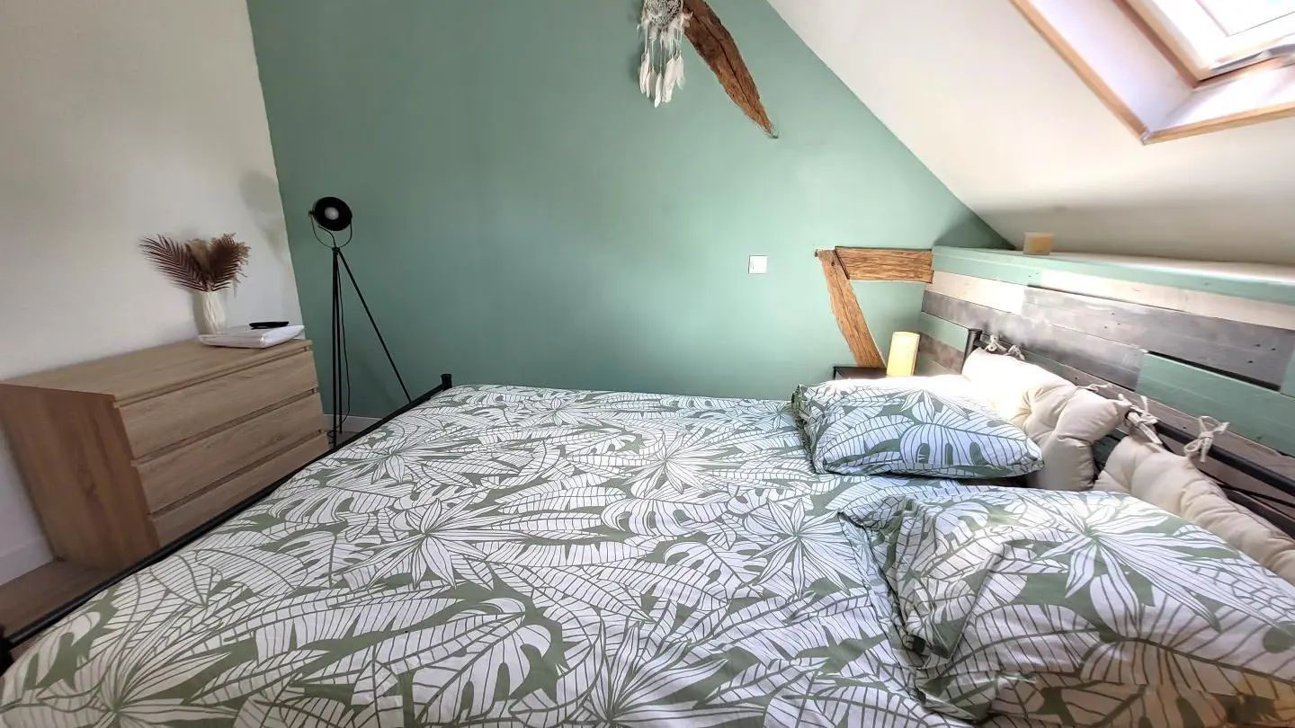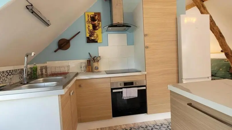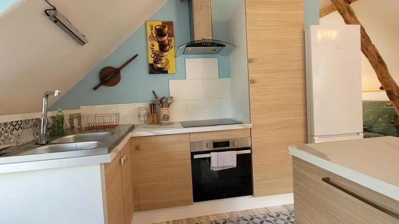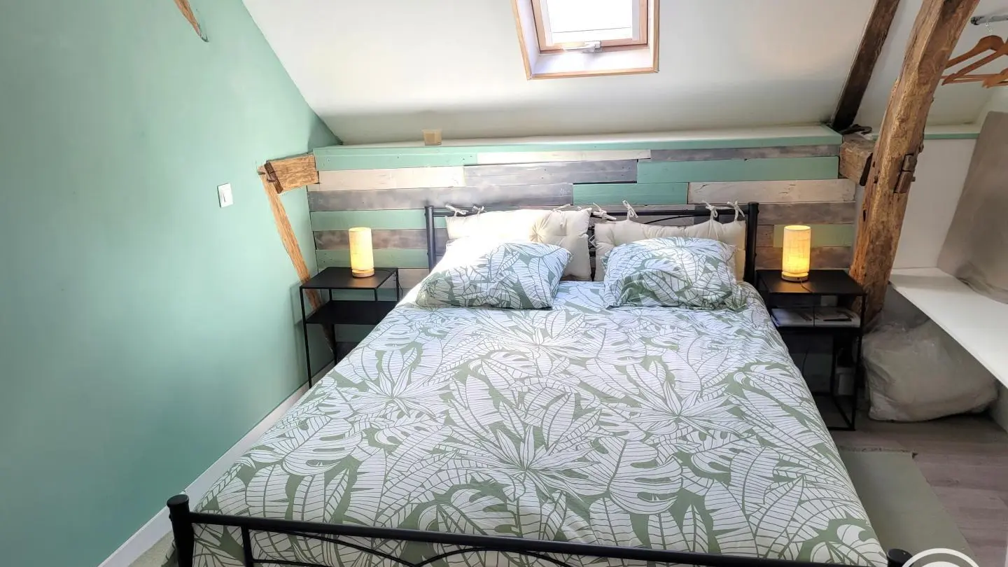 Completely restored stone barn with slate roof. - Red shutters frame a French window opening onto a small stone staircase. - Terrace equipped with garden furniture and barbecue, ideal for outdoor meals. - Quiet, leafy setting with plants and shrubs. Inside, a large attic living area with exposed wooden beams, comfortable sitting area with sofa, coffee table and TV. - Dining area with large table and chairs, fully-equipped kitchen open to the living room. -The warm, rustic decor combines modernity with elements of yesteryear. This gîte is perfect for a stay with family or friends, offering all the comforts needed to spend pleasant, relaxing moments.