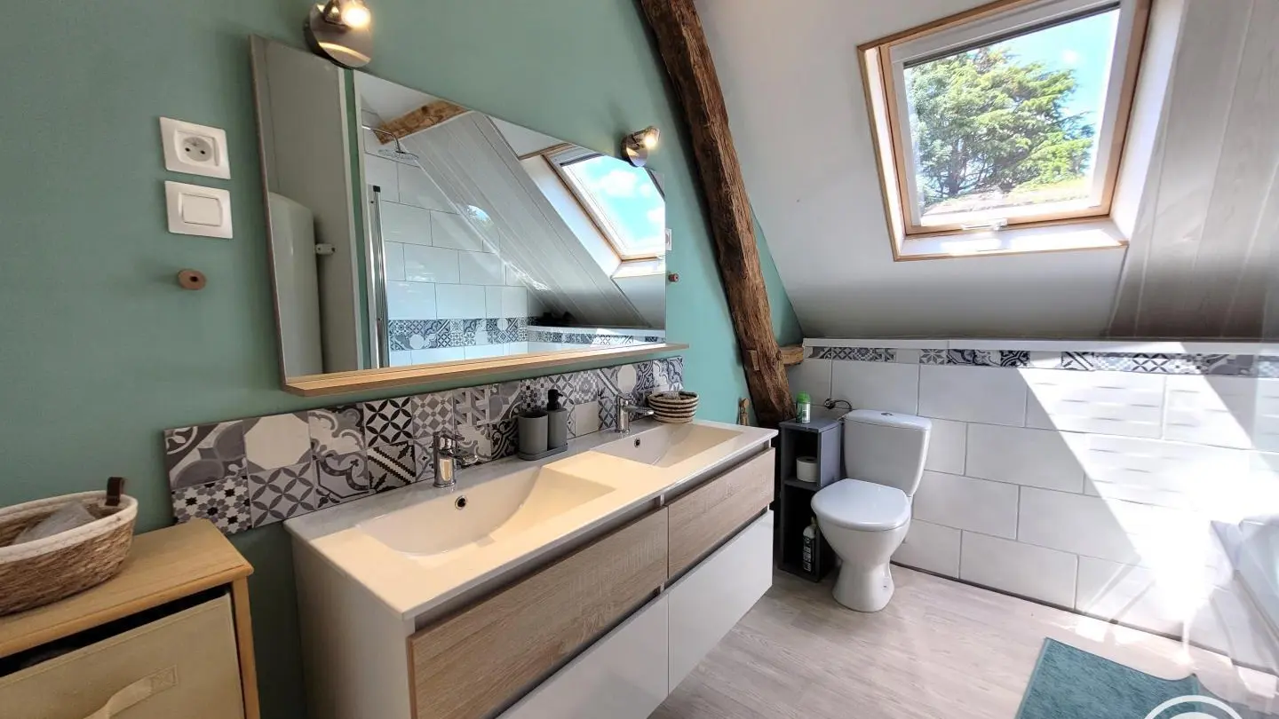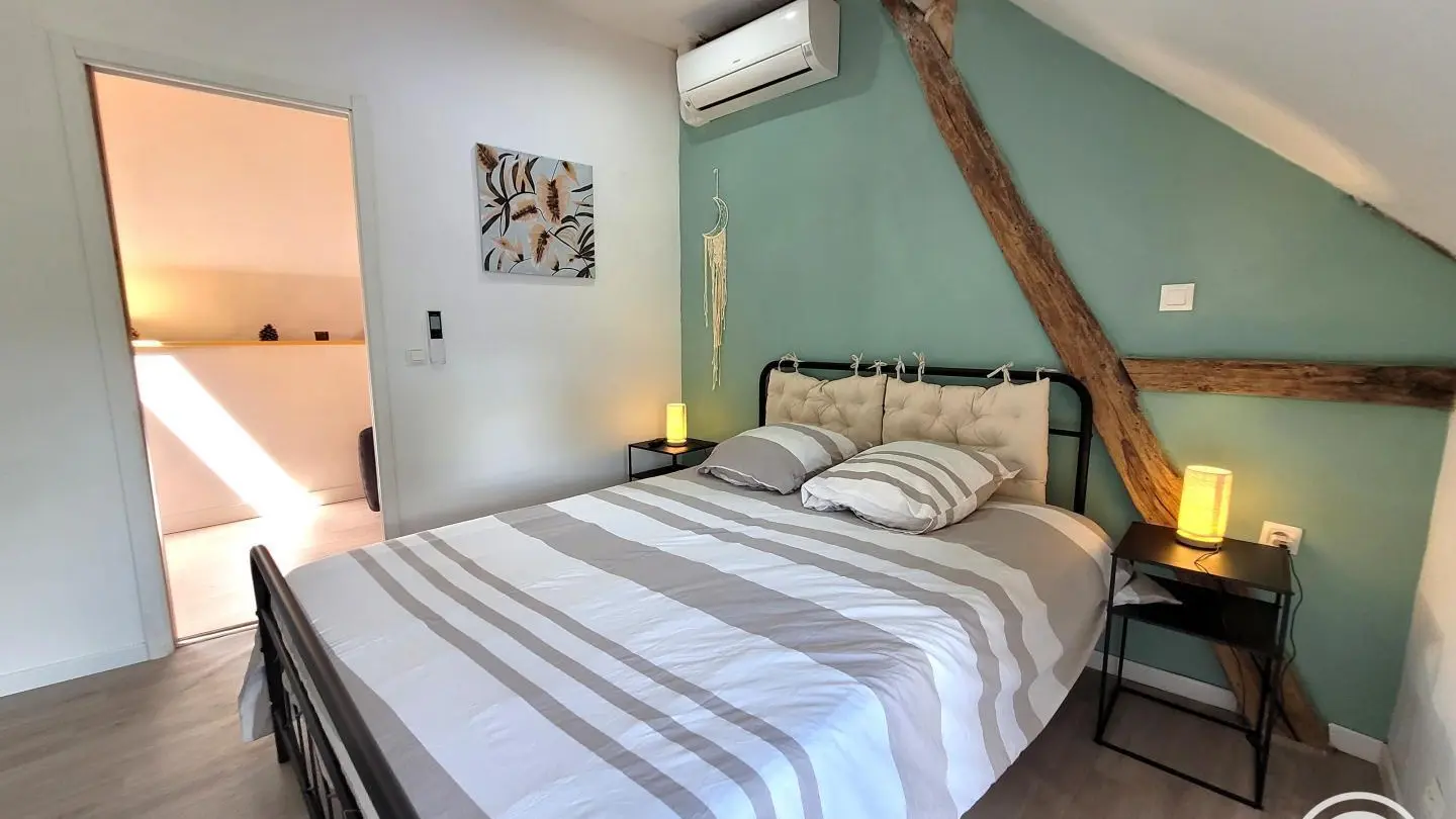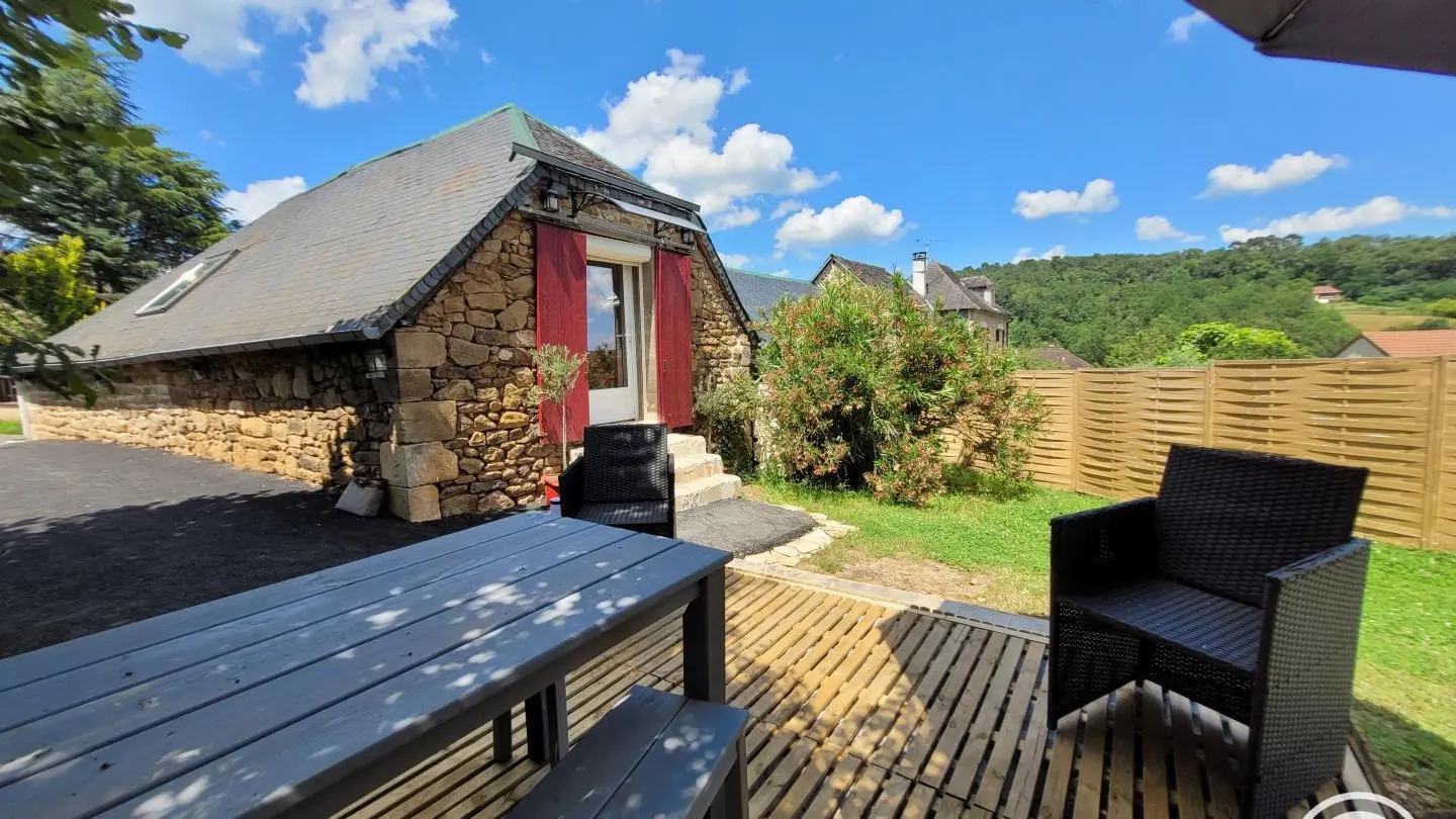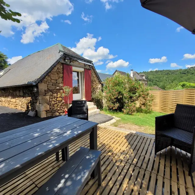 Completely restored stone barn with slate roof. - Red shutters frame a French window opening onto a small stone staircase. - Terrace equipped with garden furniture and barbecue, ideal for outdoor meals. - Quiet, leafy setting with plants and shrubs. Inside, a large attic living area with exposed wooden beams, comfortable sitting area with sofa, coffee table and TV. - Dining area with large table and chairs, fully-equipped kitchen open to the living room. -The warm, rustic decor combines modernity with elements of yesteryear. This gîte is perfect for a stay with family or friends, offering all the comforts needed to spend pleasant, relaxing moments.