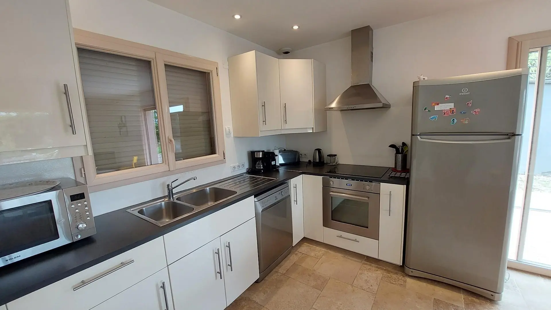 A main room with fully-equipped fitted kitchen and sitting area with TV overlooking the terraces,