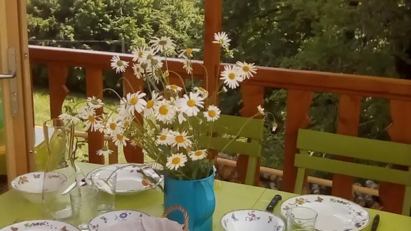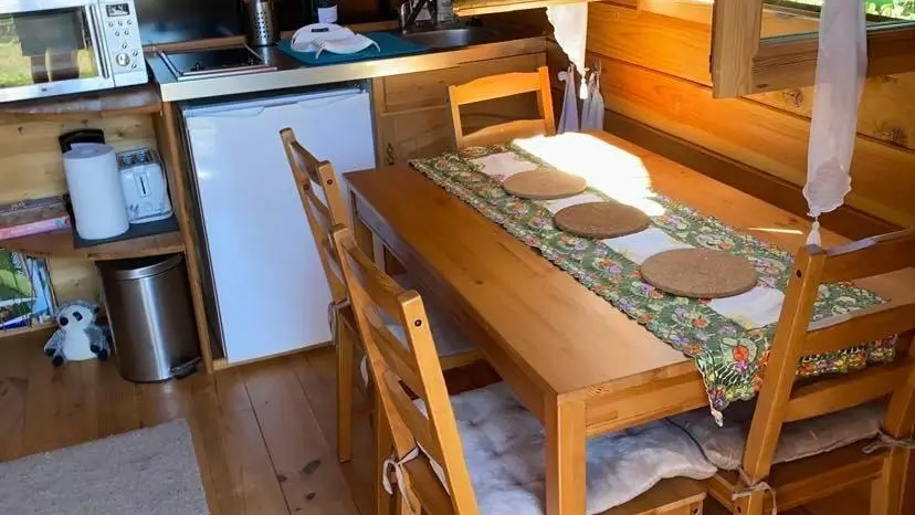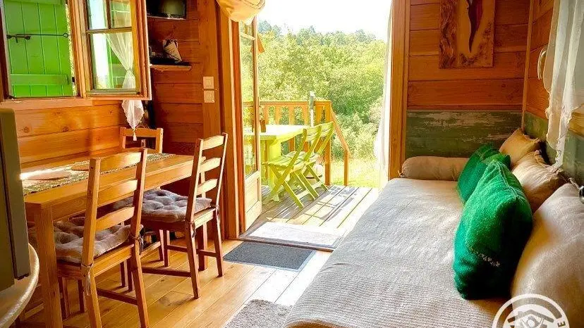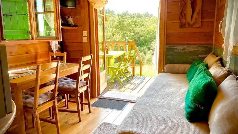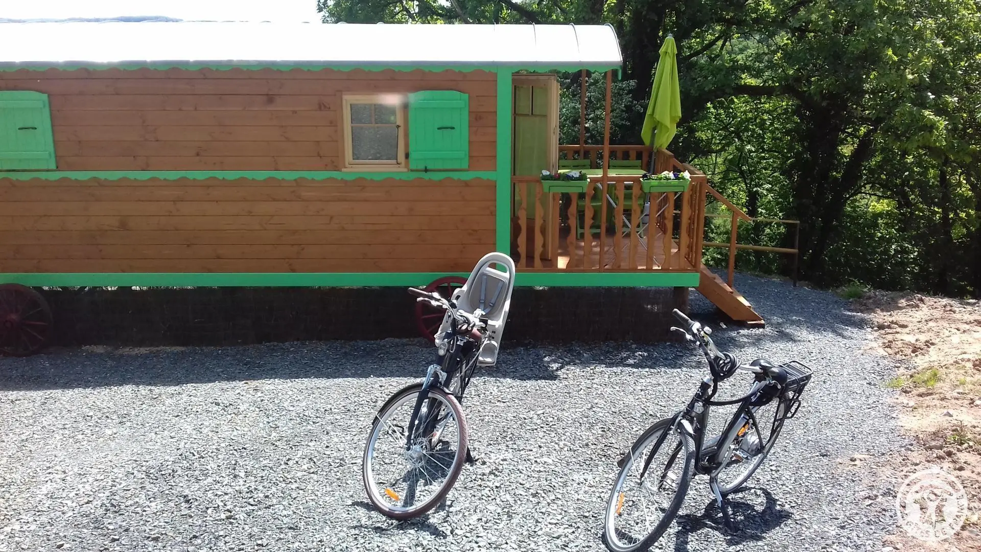 all-wood caravan, great comfort: fully-equipped kitchen and 2 90cm-wide sofa beds, corridor leading to shower room and toilet, bedroom with 160cm-wide bed, uninterrupted view over the countryside, peace and quiet guaranteed.swimming pool shared with Charlotte's gîte and the owners. Electric bikes with helmets and baby chairs are available for riding on our country roads! Close to Terrasson, Vézère valley, Lascaux caves, Sarlat, Périgueux, Brive, Pompadour, Collonges la Rouge, Rocamadour and the Gouffre de Padirac We border 3 départements: Corrèze, Dordogne, Lot Cows, horses, chickens, rabbits, dogs and cats - that's country life! Electric bikes available on site Boules pitch. Meals available on request: 26?/adult
