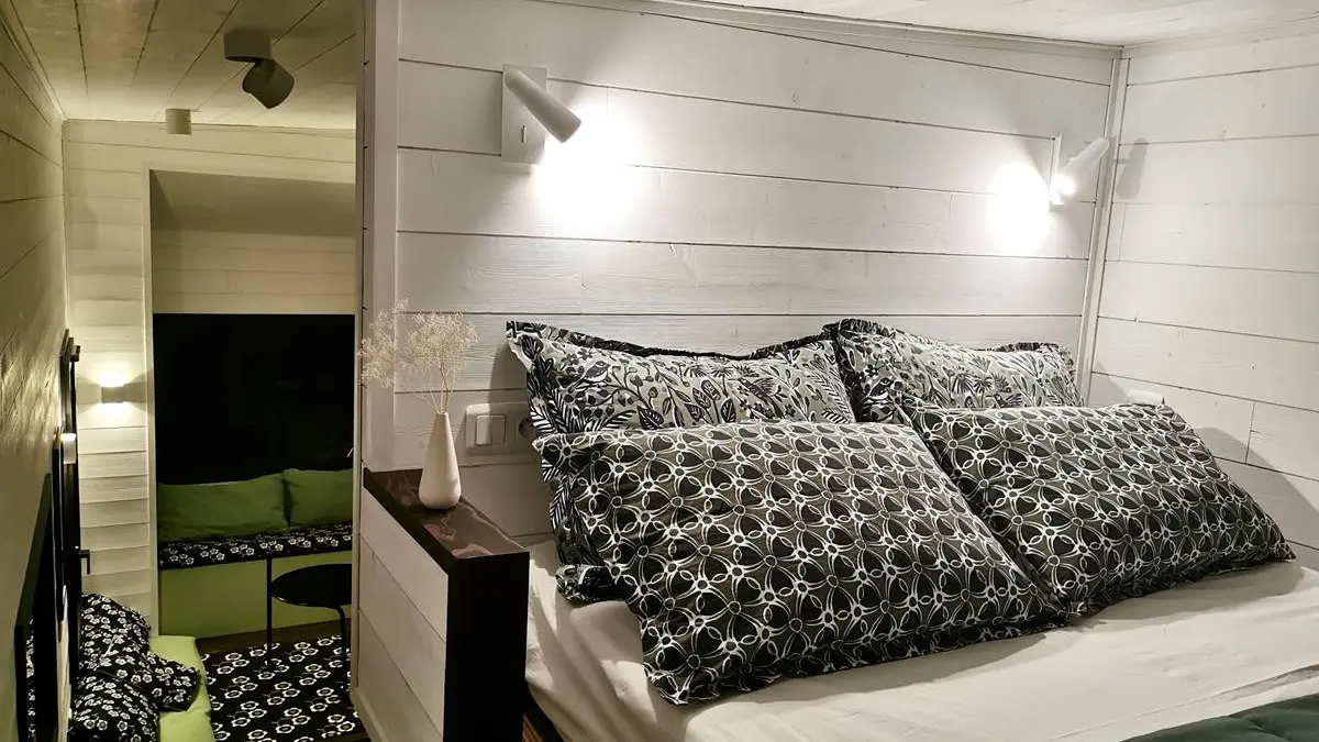 The bedroom is upstairs, and a second double bed can be quickly and easily set up in the living room.
