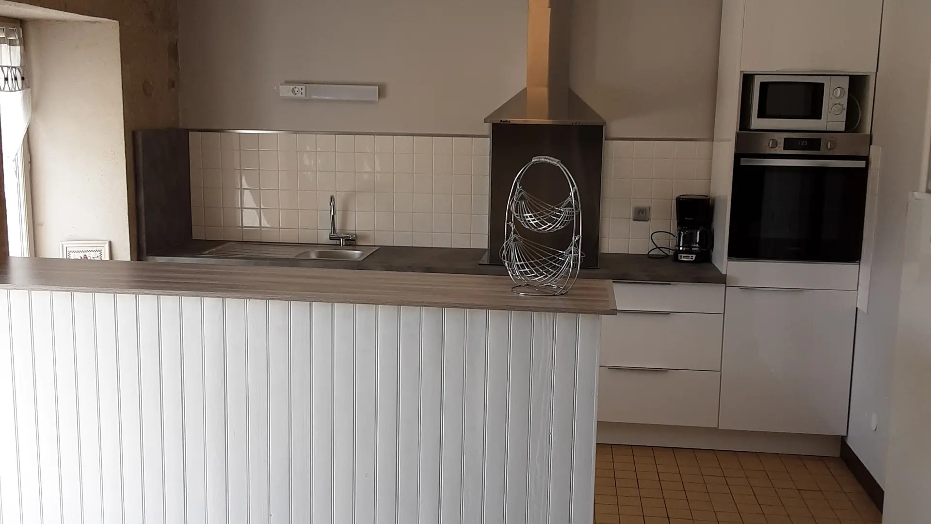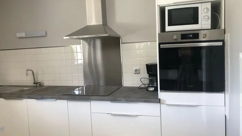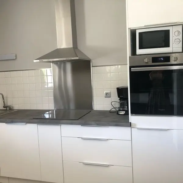 First floor: kitchen with microwave, fridge, small freezer, gas stove, coffee maker, toaster, vacuum cleaner. Living room with TV, sofa. Bathroom with walk-in shower and washing machine. Separate WC