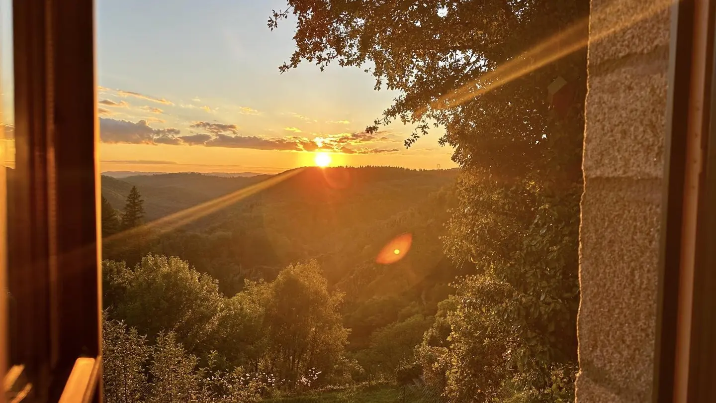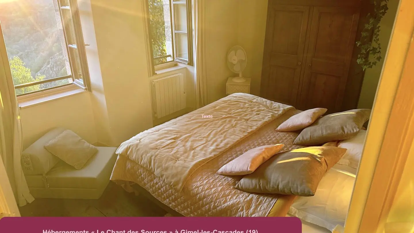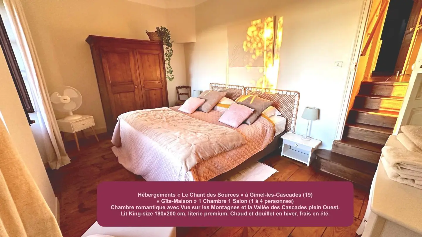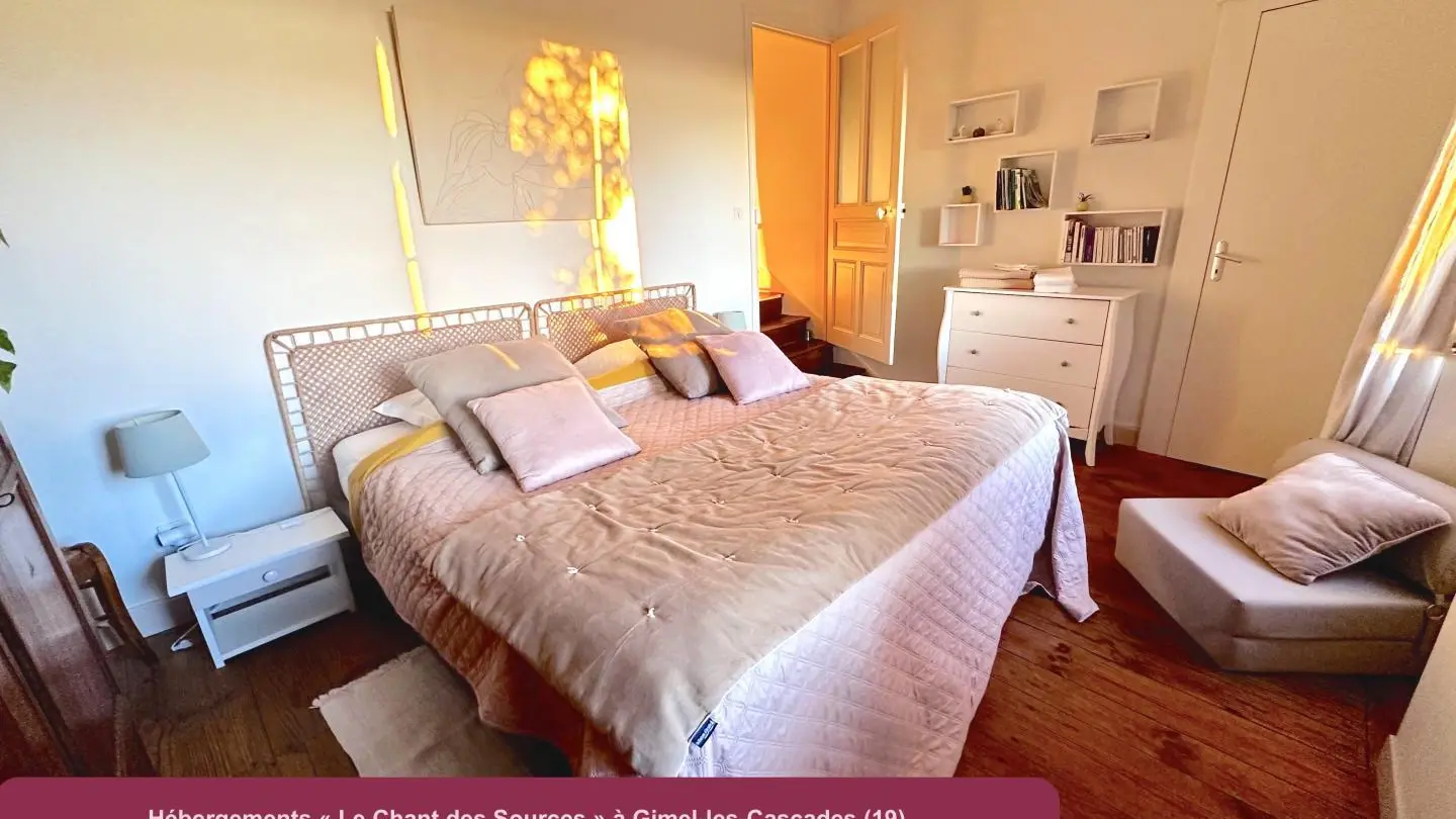 Recharge your batteries at Yves and Margaux's home, in the heart of a picturesque village lulled by the sound of three waterfalls cascading at its feet. From the bedroom and terrace overlooking the valley (outside access), you can admire the sunsets in all seasons. In winter, a wood-burning stove and all the comforts of home will make your stay comforting and cosy. A range of services (wellness massage, sonotherapy, etc.), catering (delivery possible) and a boutique are available at the adjoining Harmonie du Monde center, run by the owners. Gimel, France's first listed site, offers an exceptional natural setting in a Natura 2000 zone. Numerous bathing sites, unspoilt wilderness, a real paradise for hikers of all levels starting from the village. Located just 12 km from Tulle, you'll have access to a rich cultural offering and t ...