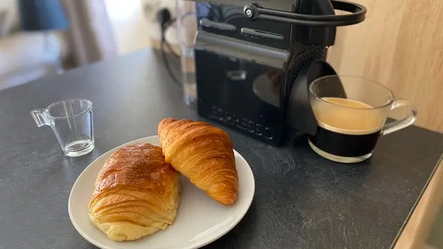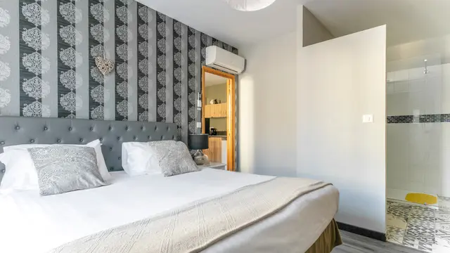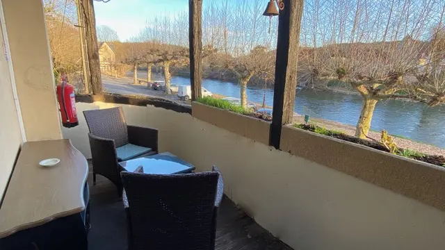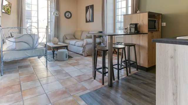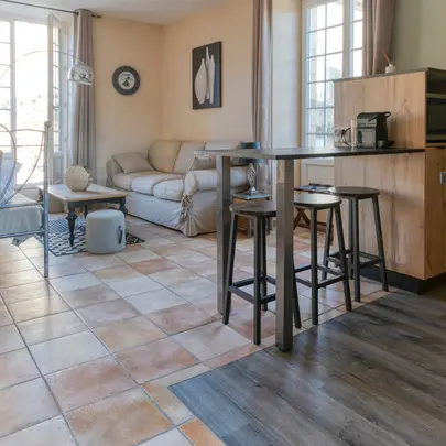 Recently renovated apartment nestled in a charming old house on the banks of the Vézère river. Bright living room with open-plan kitchen equipped with microwave, induction hob, extractor hood, dishwasher, fridge, coffee/tea maker,