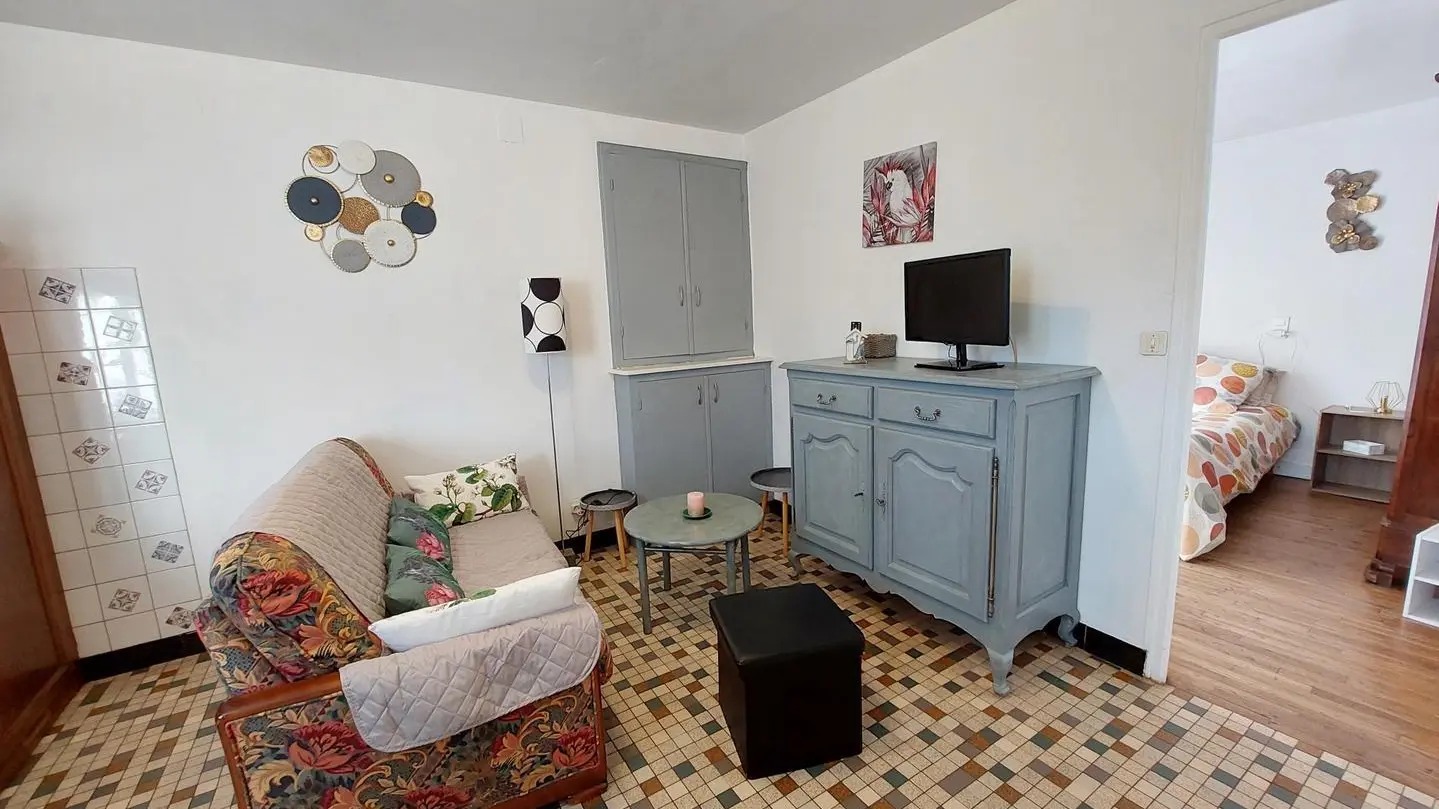 - a main room with the kitchen area and a lounge area with sofa and TV,