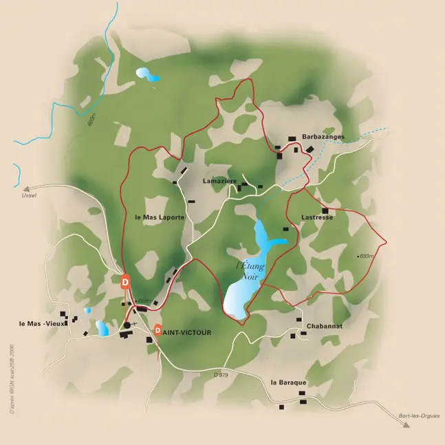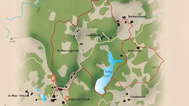 Come and discover the mysteries of Saint-Victour's heritage. Your walk will start with its castle with its singular shapes, testimony of an eventful past. Continue this adventure by looking at the murky waters of the Etang Noir, your imagination will do the rest... A gentle walk in a green setting. Variant of 6,5 km.