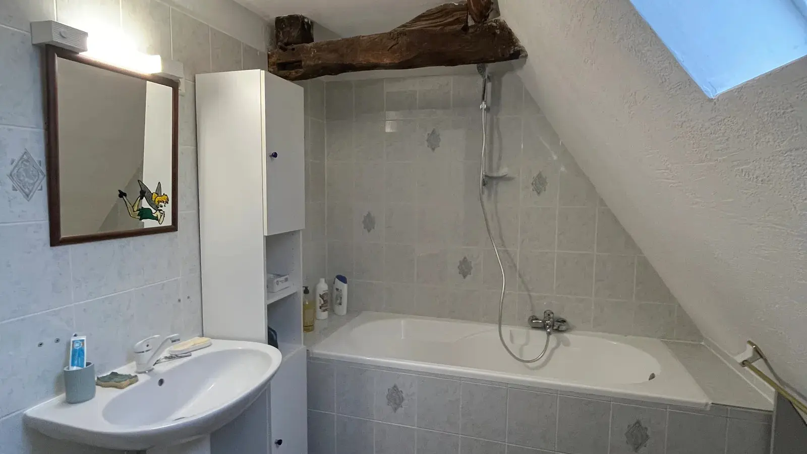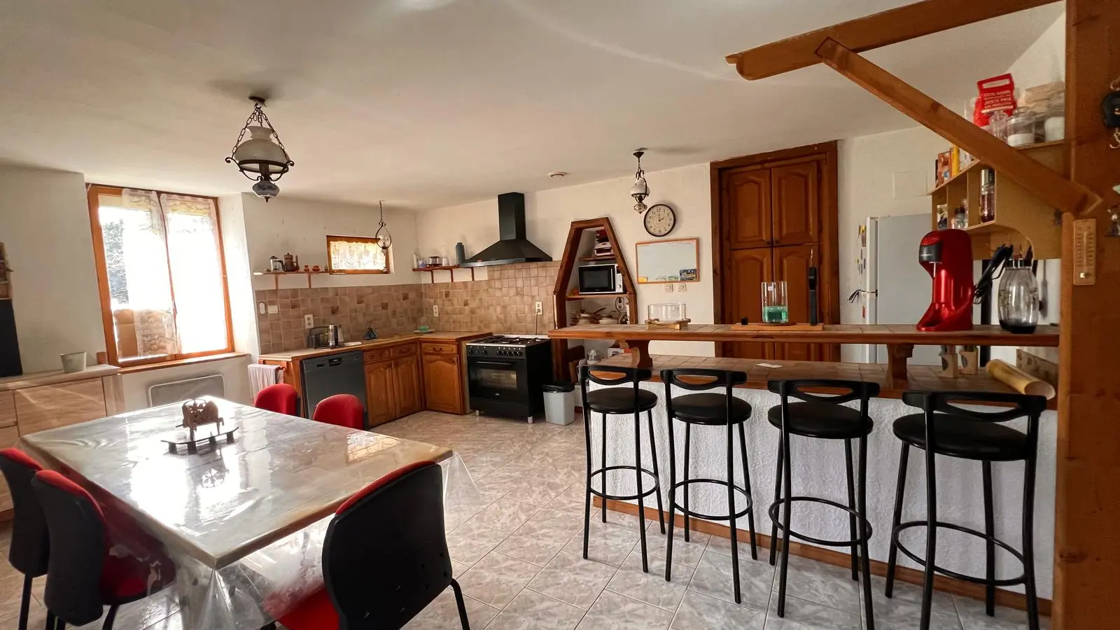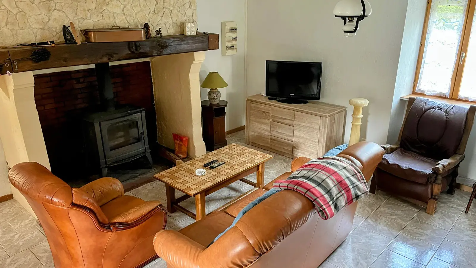 At the edge of the woods, on the first floor of a beautiful Périgord house with stone staircase and covered entrance porch, independent accommodation with kitchen/living room, lounge with sofa and two armchairs, comfortable sofa bed. Two bedrooms, one with a double bed (140cm) and a cot, and one with a double bed (160cm), bathroom with shower and bath, two WCs, large wooded garden of half a hectare with ample parking. Linen provided except for cot. Numerous activities on site and restaurant 100m away.
