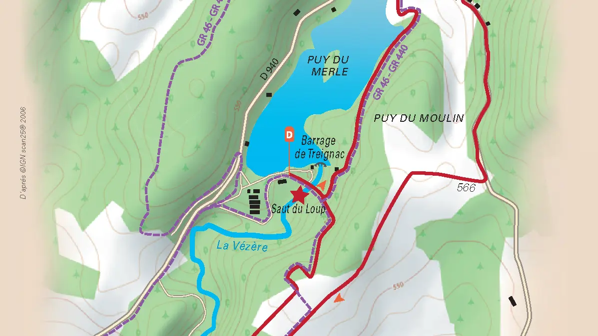 This path leads to one of the most beautiful views of the medieval town of Treignac. Firstly, it follows the Vézère, a river appreciated by fishermen and kayak enthusiasts, and leads to the emblematic site of Saut du Loup. Then, it is through woods, water and meadows that this loop will return to the lake of Bariousses, place of bathing and water sports classified Blue Flag.