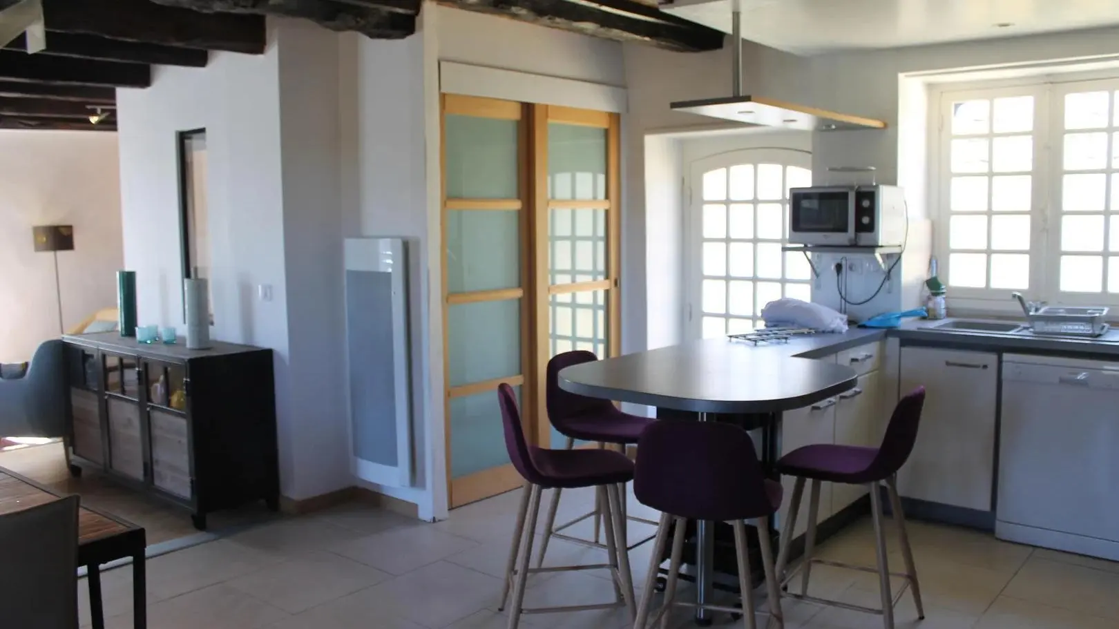 An integrated kitchen and its dining area with open fireplace and wood stove,