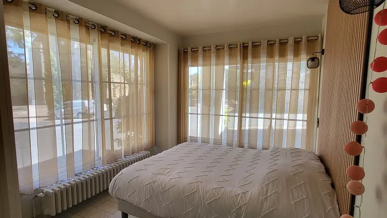 On the first floor, you'll find an entrance hall with study, toilet and washbasin, laundry area with washing machine, clothesline, ironing board + iron. A first bedroom with 160x200 bed and closet.