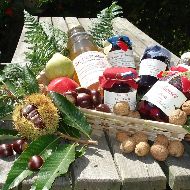 Farm inn specialities: tartines, crêpes, jams, sorbets, homemade pastries made with fruit from the farm.