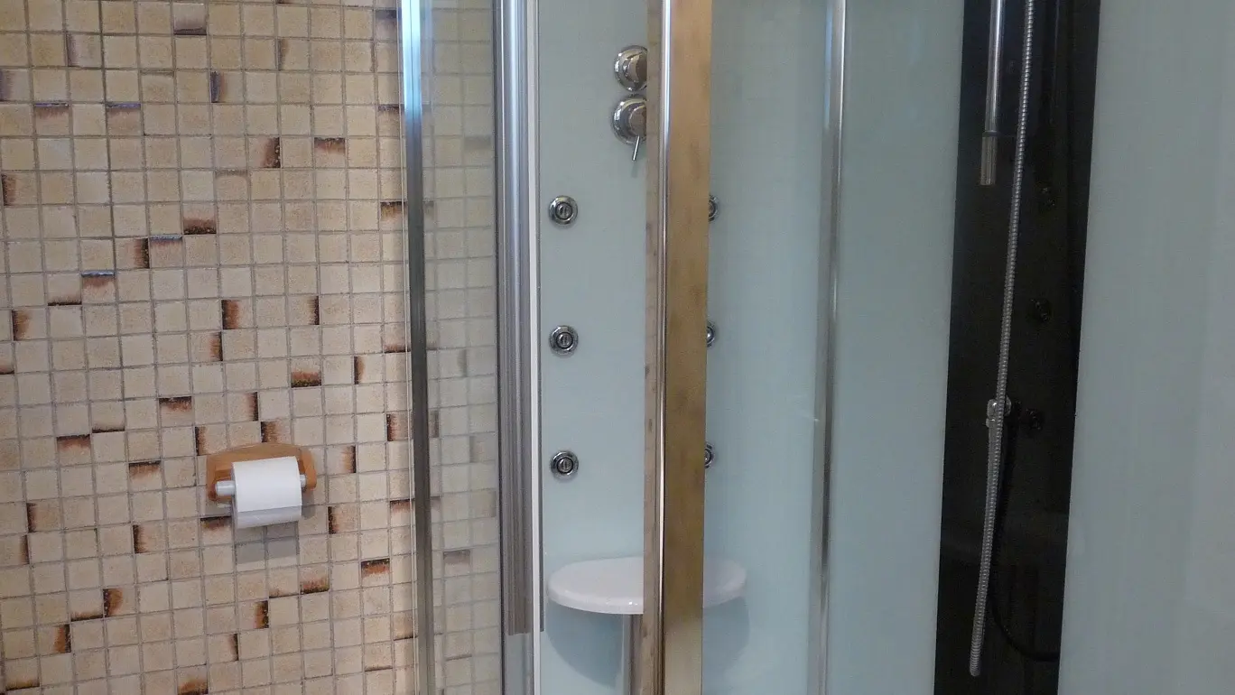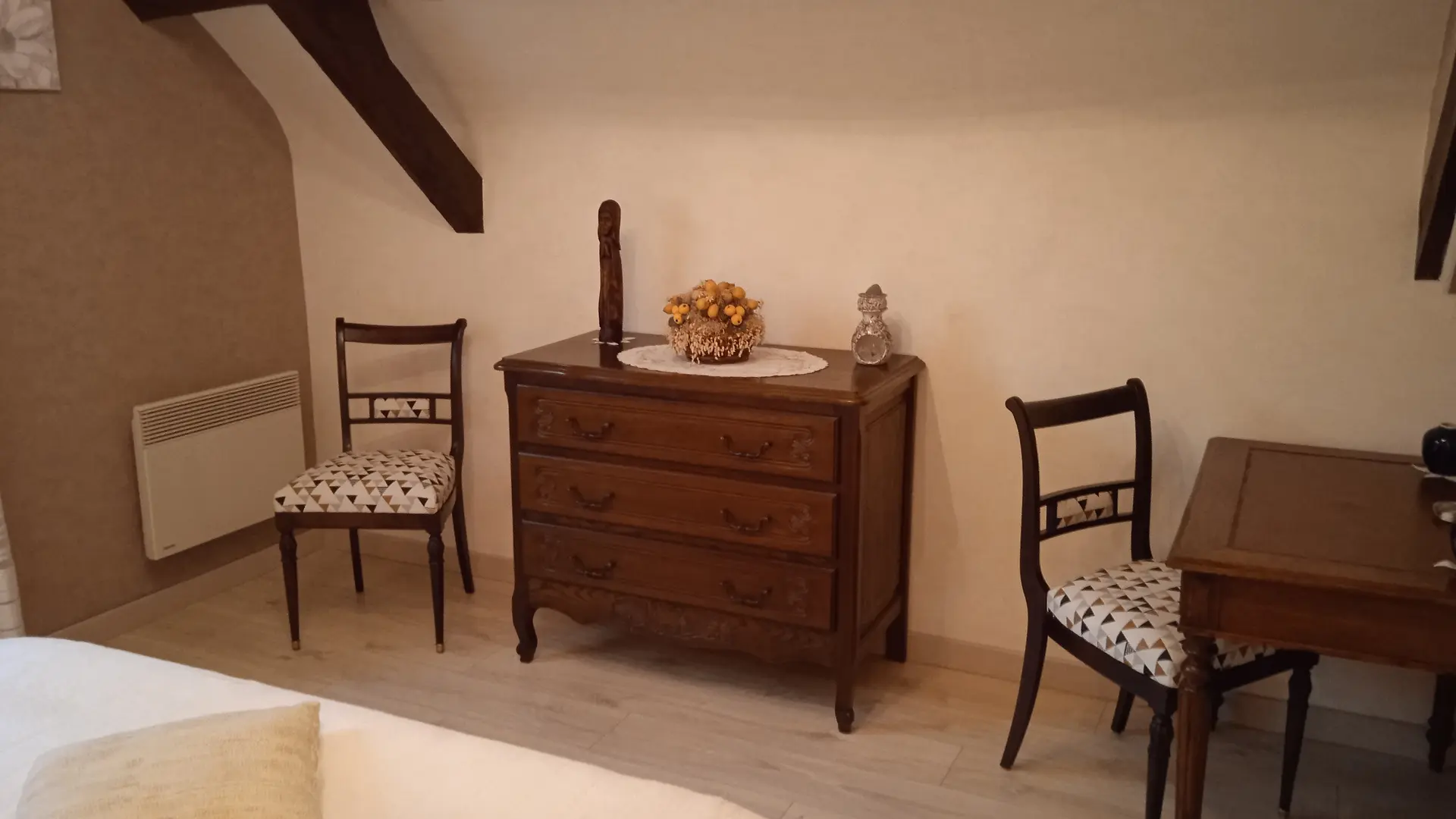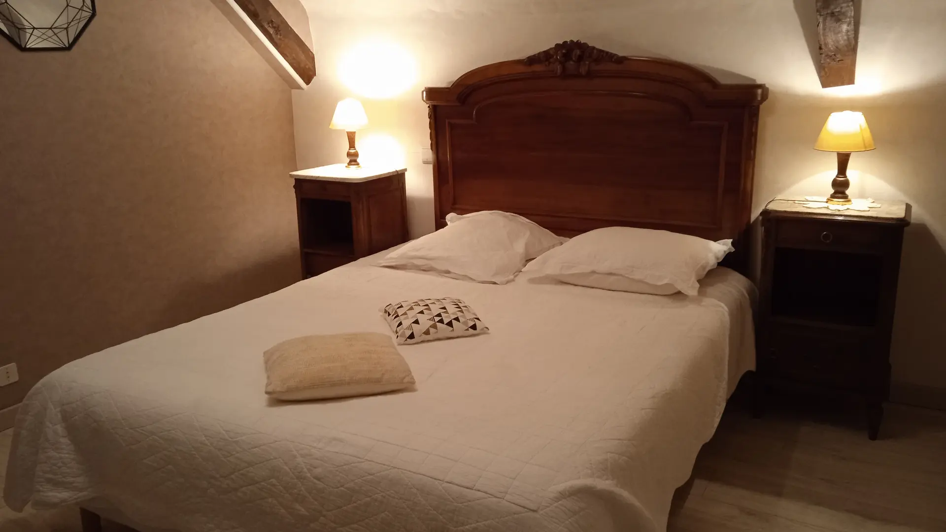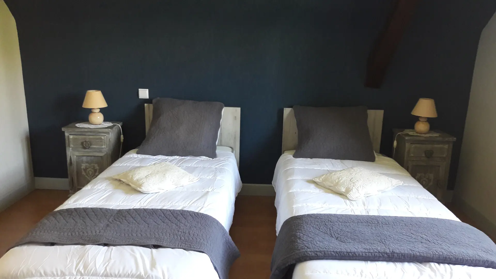 The gîte has two bedrooms upstairs, each with its own shower room/WC. The first has a 160cm bed that can be converted into two 80cm beds, while the second has a 160cm bed.
