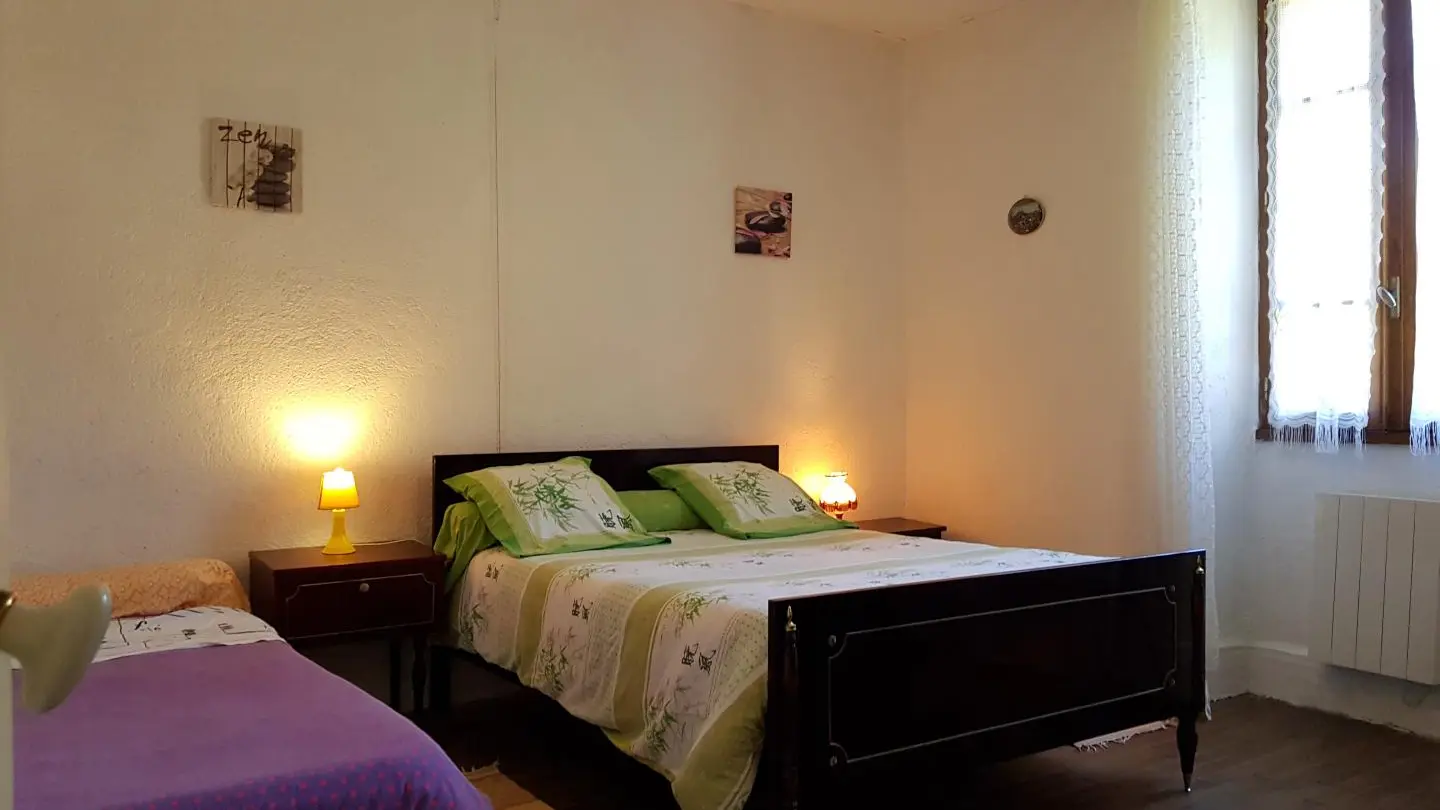 Detached house with enclosed grounds. 2 bedrooms (2 double beds, 1 single bed). Kitchen with fireplace, living room (sofa bed), microwave, freezer. Electric and wood heating (free wood). 800m² fenced garden and 70m² courtyard.