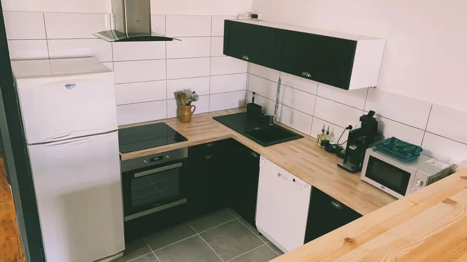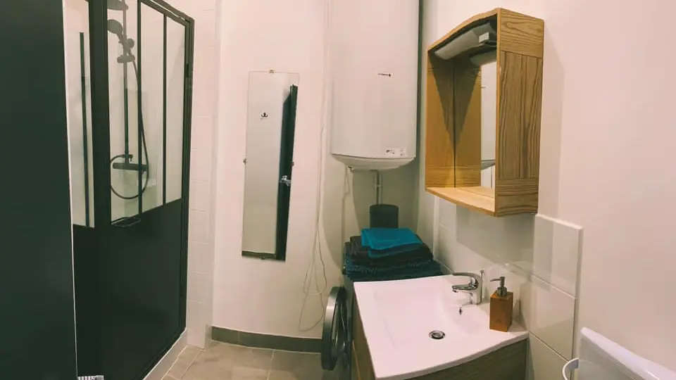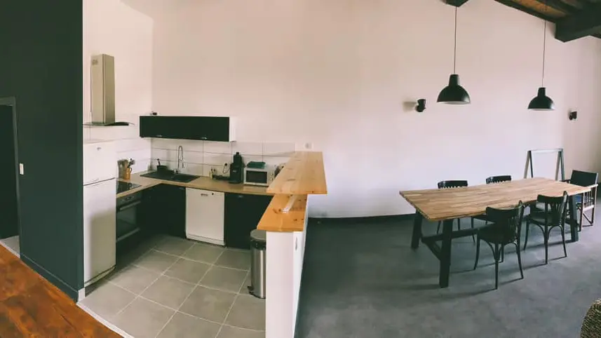 Both functional and warm, with a capacity of 2 to 4 people, the apartment consists of a large living room - including the living room, dining room and a fully equipped open kitchen -, a large bedroom, a bathroom and a toilet.