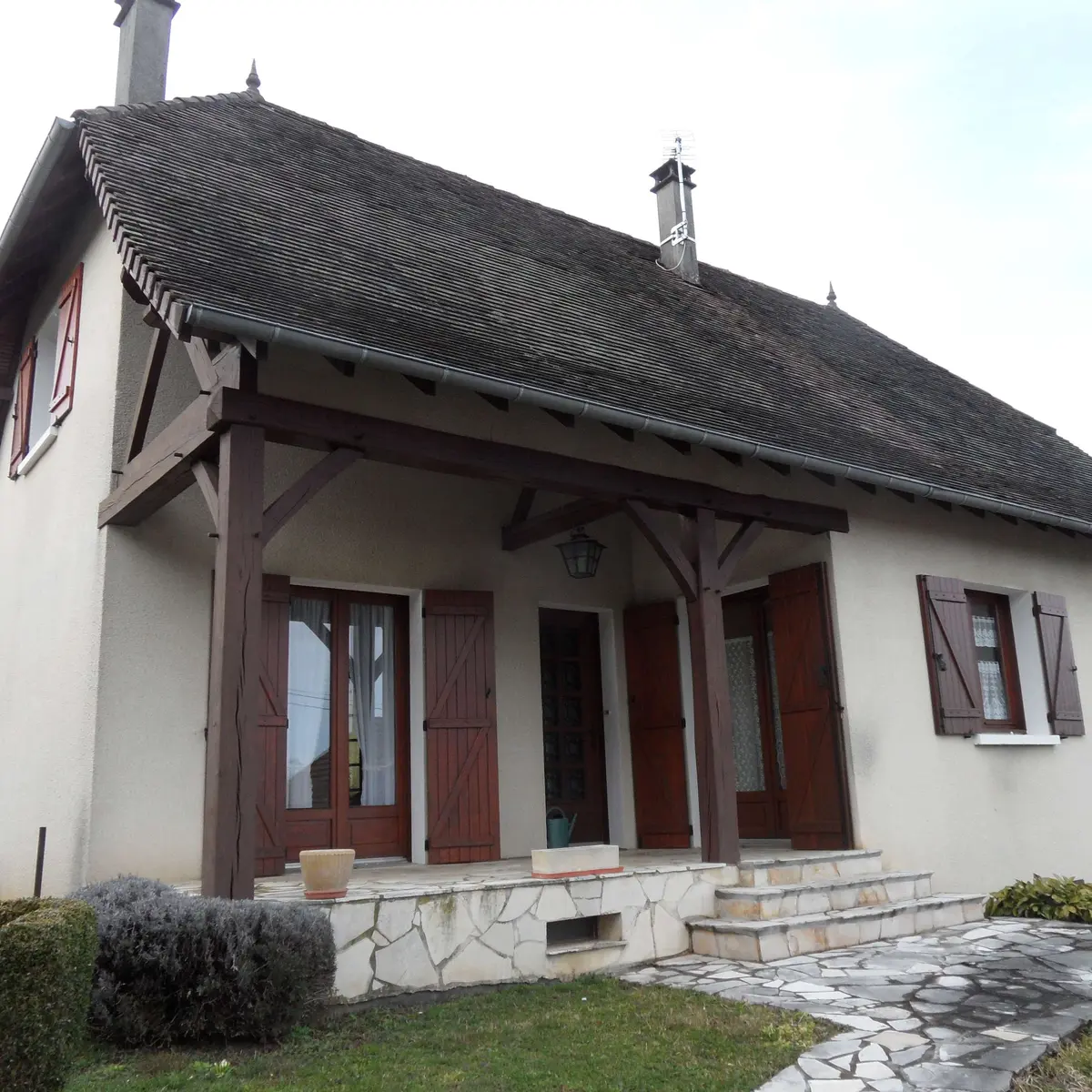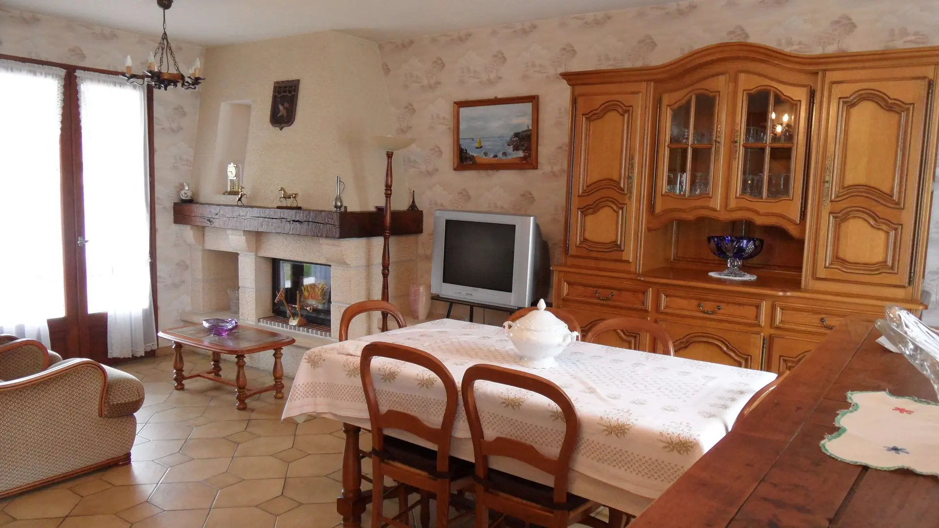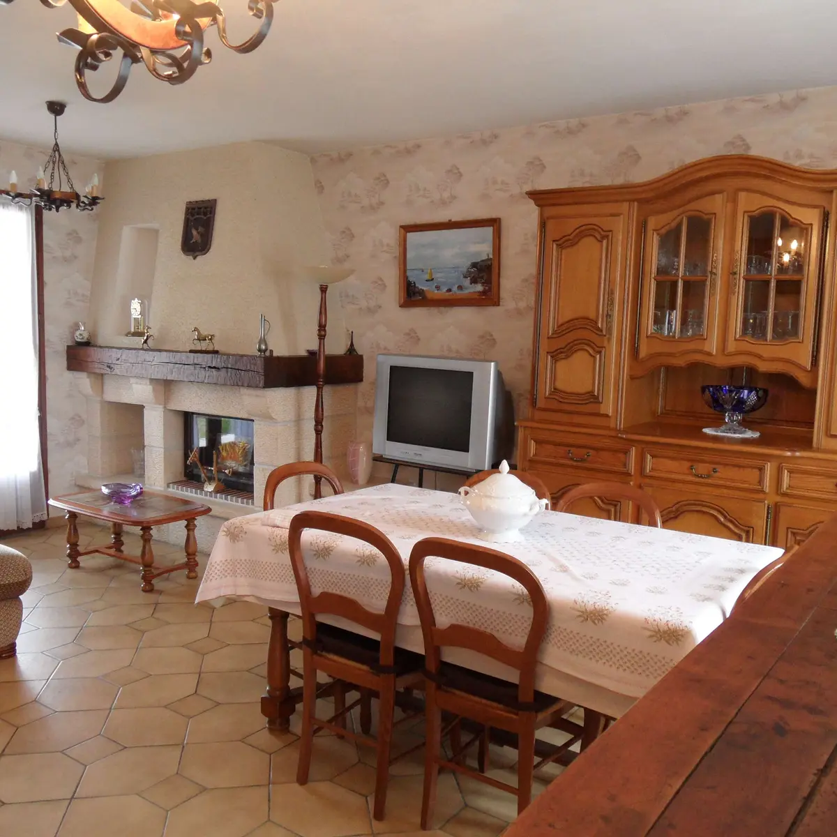 House 300m from the National Stud of Pompadour, close to all shops and activities on foot, enclosed grounds. Basement, garage, washing machine, fridge, freezer, gas cooker, barbecue, garden furniture. Equipped kitchen: fridge, oven, electric hob, dishwasher, microwave, toaster, coffee machine, kettle. Dining room, living room, a sofa, two armchairs, TV. Two bedrooms with double bed, bathroom.