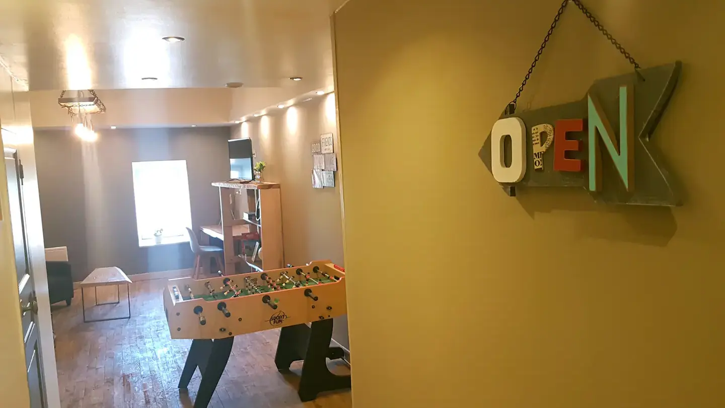 - Middle floor: 1 large bedroom with 140cm bed, small lounge, shower room, WC, table soccer, TV, office.