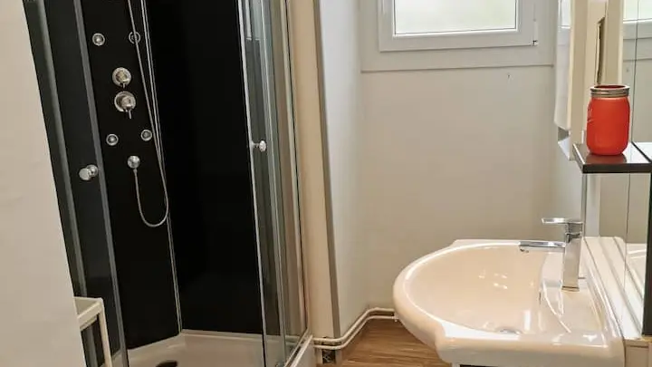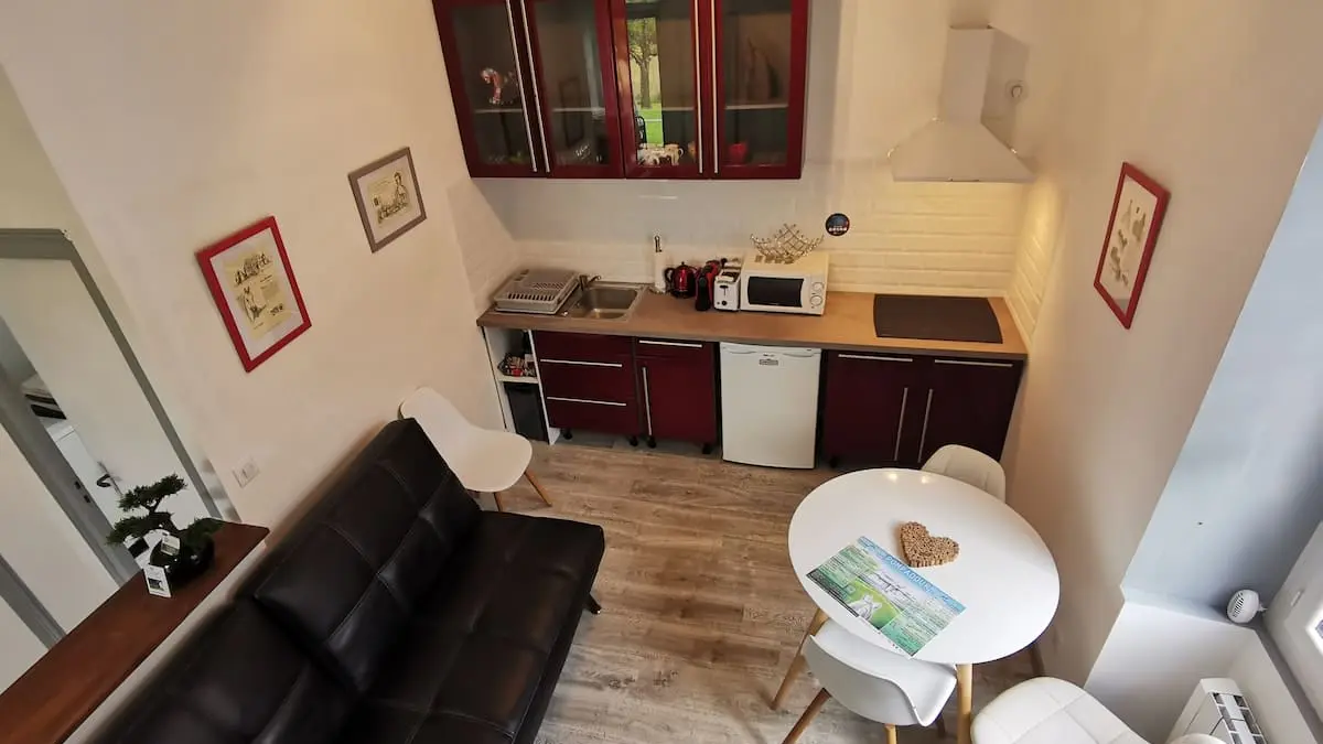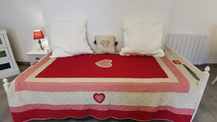 Ground floor: living room with sofa and TV, fully-equipped open-plan kitchen (fridge, induction hob, kettle, coffee maker and toaster) and dining area, shower room with washing machine, separate WC. Upstairs, a spacious bedroom with 1 double bed and 1 single bed.