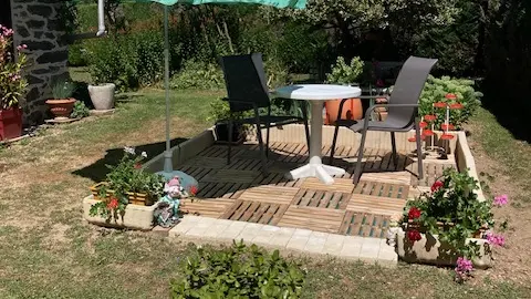 Outside, you'll enjoy a pleasant space with garden furniture and parasol, perfect for relaxing outdoors.