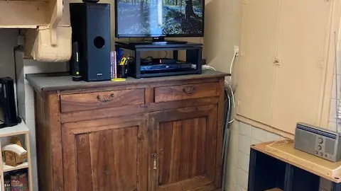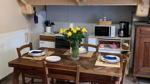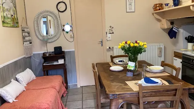The convivial living room is equipped with fridge-freezer, oven, microwave, coffee-maker and all you need to cook like at home. A washing machine is also available. Free WIFI.