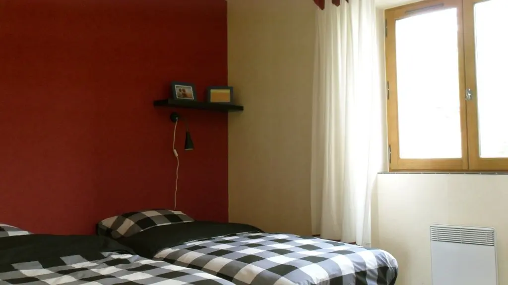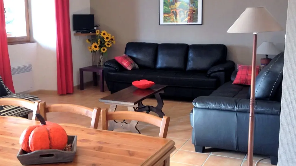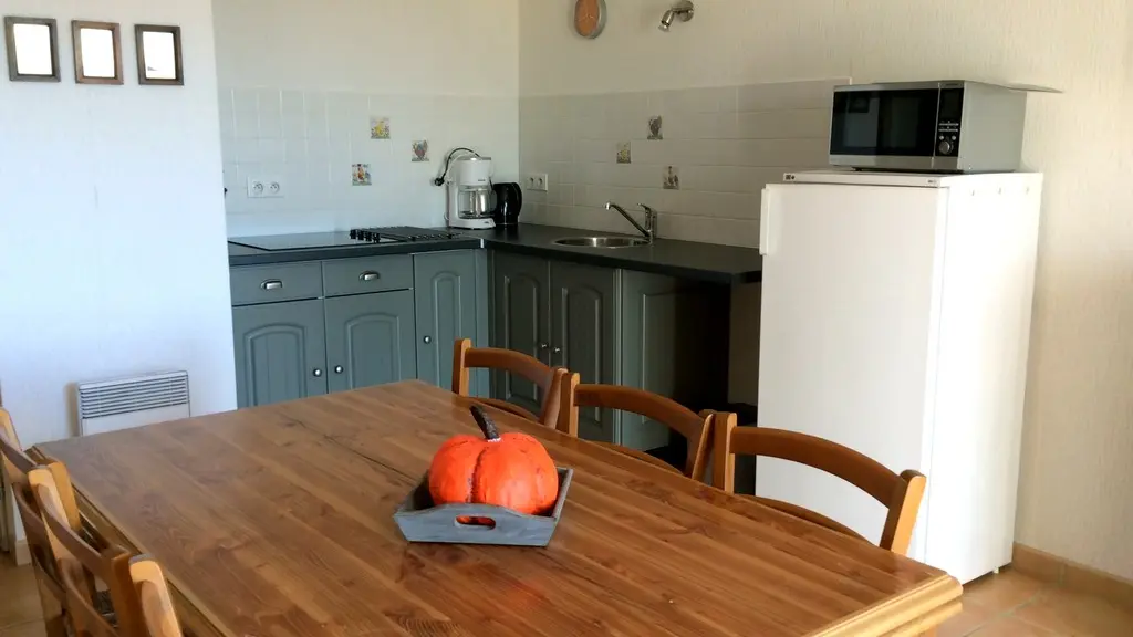 After the beautiful covered terrace facing the fields, the accommodation is composed of 3 rooms and can accommodate up to 6 people. The whole is vast, colorful and nicely decorated with its living room (1 sofa bed 2 places, sofas, TV, HIFI, WIFI), its well arranged kitchen and the 2 bedrooms (1 bed 140, 2 beds 90). The bathroom/WC is equipped to welcome a person with a slight motor handicap (walk-in shower, seat and grab bar).