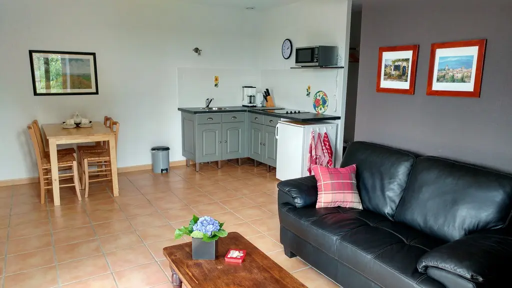 The Rouge-Gorge accommodates 2 people and consists of a living room with a sitting area, a dining area and a fitted kitchen. The bedroom and the bathroom are independent. The whole is rational, very pleasant and well decorated. On the practical side, a laundry room common to the 4 accommodations is available to clients in another building. Linen is provided and beds are made upon arrival.