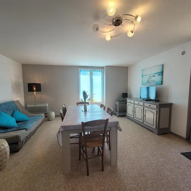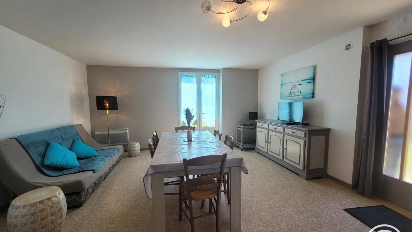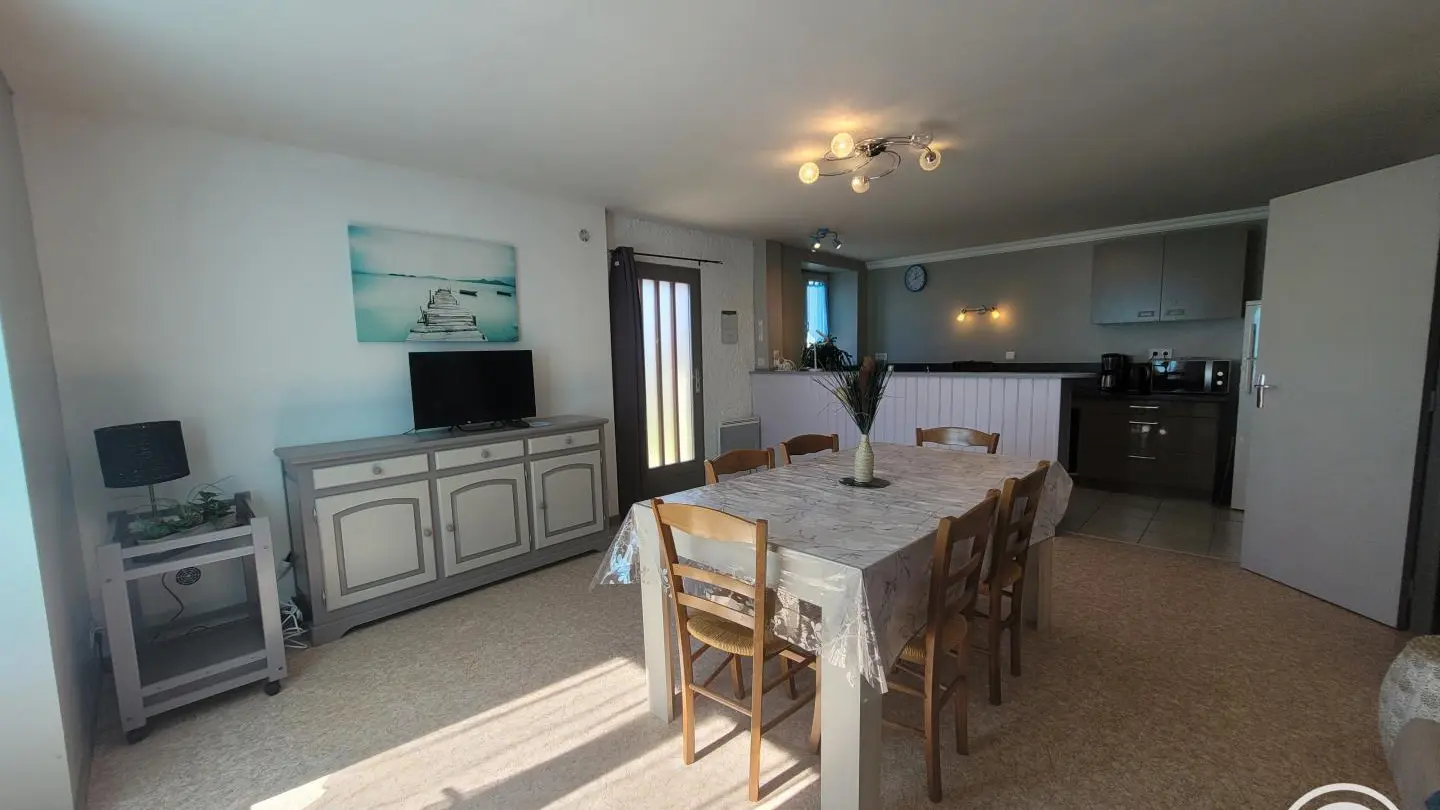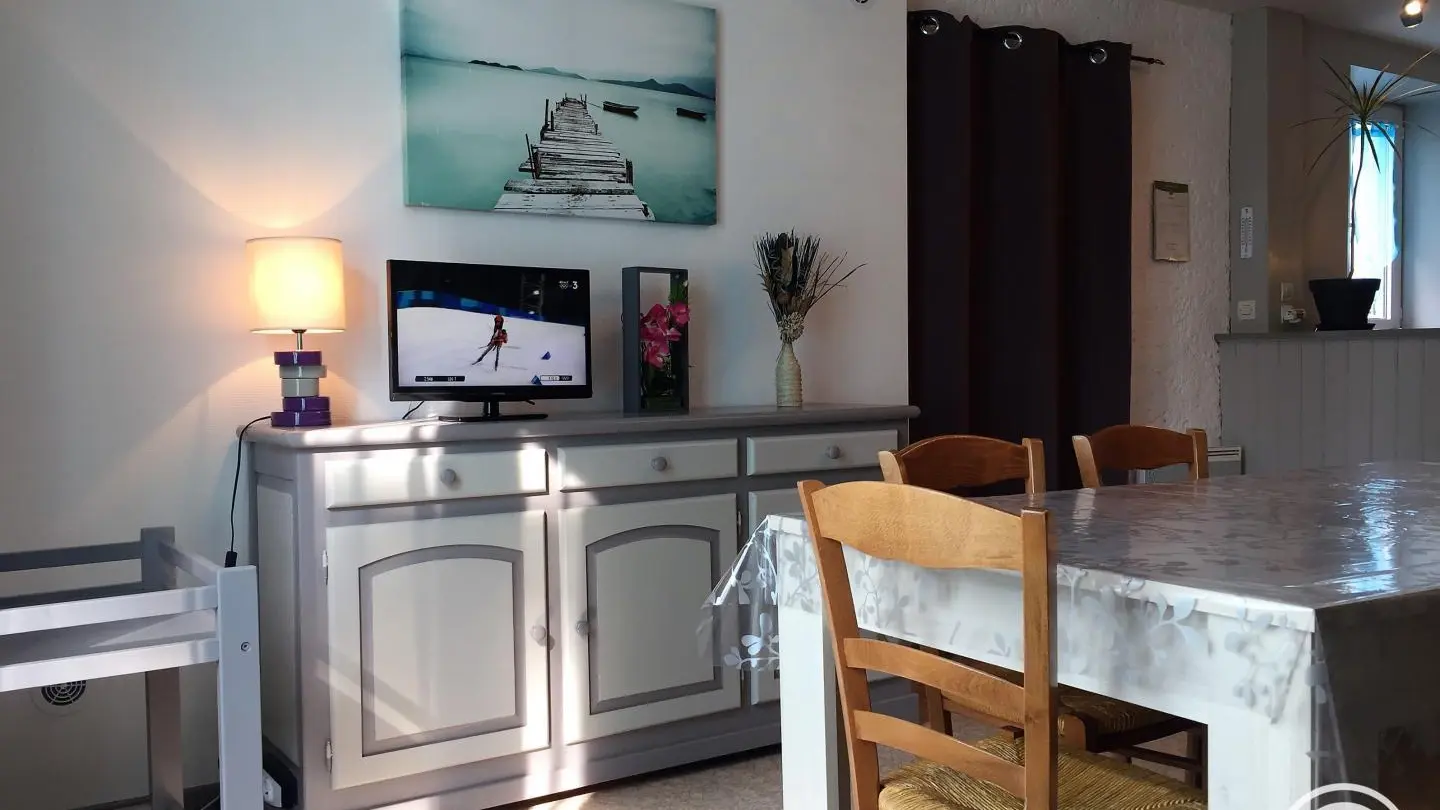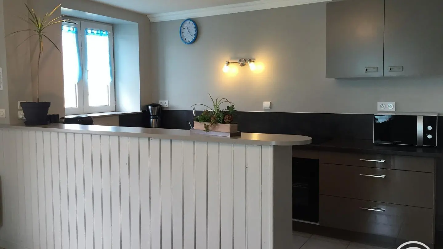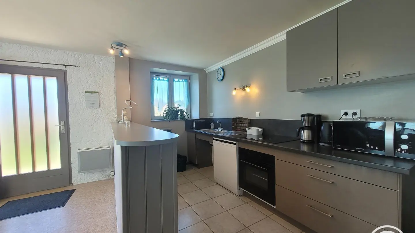 Gîte with separate entrance, in an old farmhouse renovated into 5 gîtes, on the edge of a lake with shared, unfenced grounds (approx. 7,000 m2), adjoining gîte no. 4 above. This apartment comprises a bedroom (1 double bed), a spacious living room (sofa bed) with fitted kitchen, washing machine, dishwasher, 1 folding bed on request. Electric heating. WIFI 4K TV. Bathroom with toilet (same room) and shower with facilities for disabled guests. A cleaning kit with eco-responsible products will be provided. Baby equipment available free of charge upon reservation. Pets welcome under owner's responsibility and with respect for the gîte and other residents.