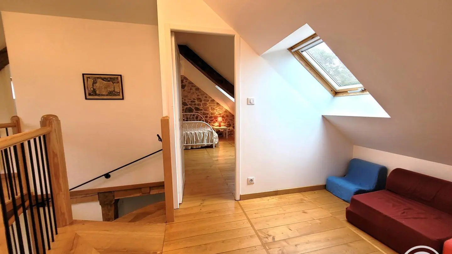 Superb, lovingly restored, character stone farmhouse in the heart of a small hamlet. Ideal for large groups, you'll benefit from the calm, space and nature surrounding the gîte. Semi-independent house, very bright thanks to its many windows, with terrace, private garden and courtyard. Benefits: panoramic views of the surrounding countryside from the terrace and bedrooms, comfortable, complete baby equipment.
