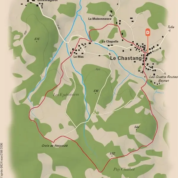 You will walk along wide paths through meadows and undergrowth in this chestnut village, from which it takes its name. You will arrive on a portion of path cut in the granite before seeing the pond of Coiroux and its many tourist facilities. Hamlets, the good fountain Ste-Caquette, the old school... will punctuate your walk.
