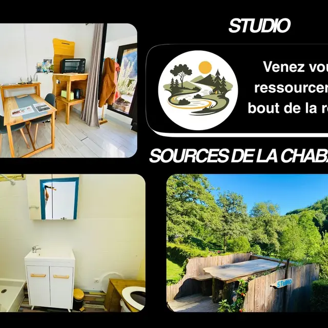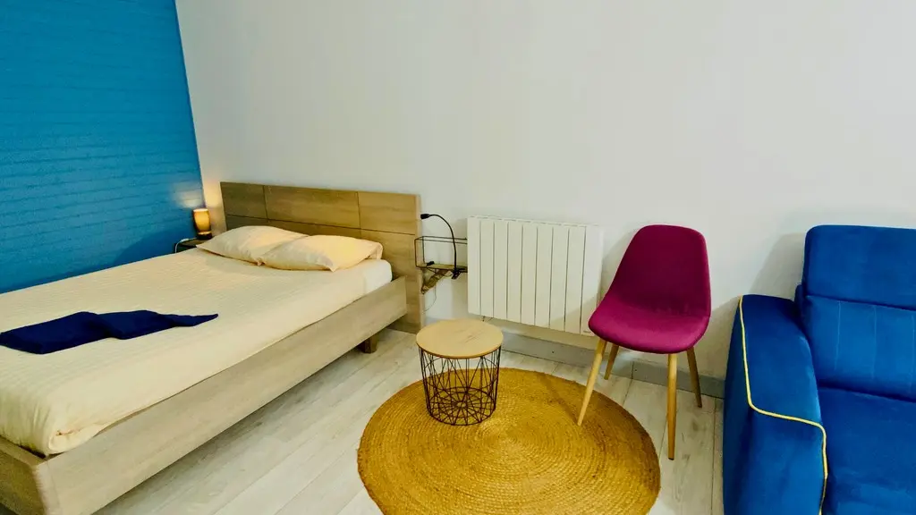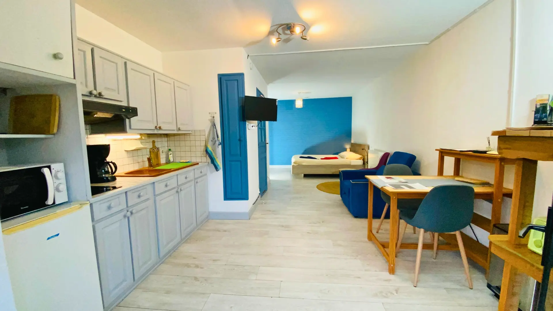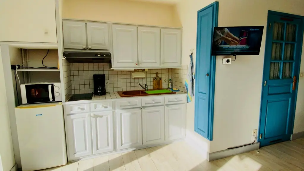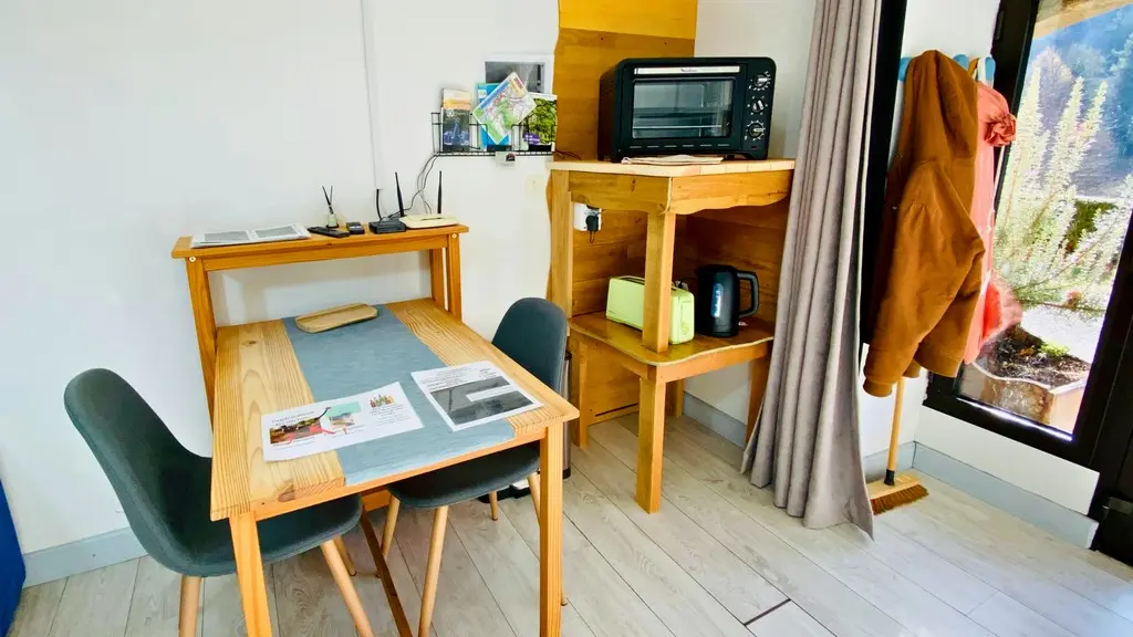 There are several vacation accommodations on site, including a single-storey studio at number 1. It features a well-equipped kitchenette (mini-oven, ceramic hob, small appliances), a dining area, a comfortable armchair (connected TV, Wibox subscription) and a 140cm bed. A large closet and a shower room/dry toilet complete this simple, functional unit.